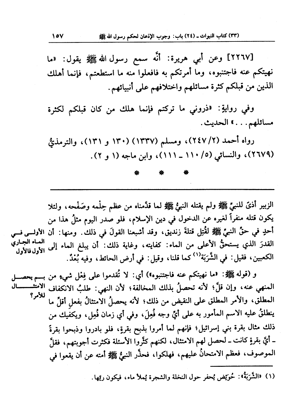 [2267] وعن أبي هُرَيرَةَ أَنَّهُ سَمِعَ رَسُولَ اللَّهِ صَلَّى اللَّهُ عَلَيهِ وَسَلَّمَ يَقُولُ: مَا نَهَيتُكُم عَنهُ فَاجتَنِبُوهُ، وَمَا أَمَرتُكُم بِهِ فَافعَلُوا مِنهُ مَا استَطَعتُم فَإِنَّمَا أَهلَكَ الَّذِينَ مِن قَبلِكُم كَثرَةُ مَسَائِلِهِم، وَاختِلَافُهُم عَلَى أَنبِيَائِهِم.