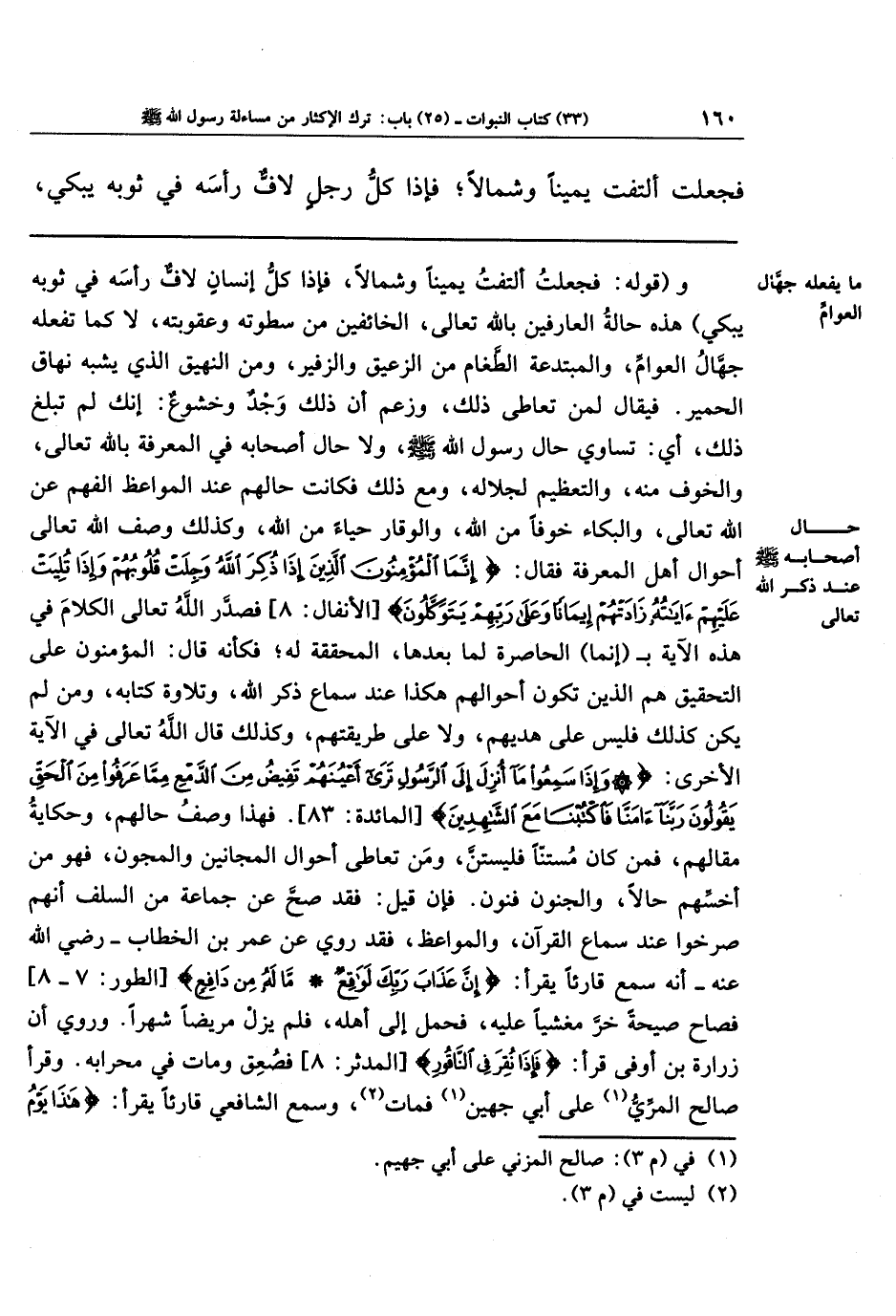 و(قوله: فجعلت ألتفت يمينًا وشمالًا، فإذا كل إنسان لافٌّ رأسه في ثوبه يبكي) هذه حالة العارفين بالله تعالى، الخائفين من سطوته وعقوبته، لا كما تفعله جُهَّال العوام، والمبتدعة الطَّغام من الزعيق والزفير، ومن النهيق الذي يشبه نهاق الحمير. فيقال لمن تعاطى ذلك، وزعم أن ذلك وجد وخشوع: إنك لم تبلغ ذلك، أي تساوي حال رسول الله ـ صلى الله عليه وسلم ـ ولا حال أصحابه في المعرفة بالله تعالى، والخوف منه، والتعظيم لجلاله، ومع ذلك فكانت حالهم عند المواعظ الفهم عن الله تعالى، والبكاء خوفًا من الله، والوقار حياءً من الله، وكذلك وصف الله تعالى أحوال أهل المعرفة فقال: {إِنَّمَا المُؤمِنُونَ الَّذِينَ إِذَا ذُكِرَ اللَّهُ وَجِلَت قُلُوبُهُم وَإِذَا تُلِيَت عَلَيهِم آيَاتُهُ زَادَتهُم إِيمَانًا وَعَلَى رَبِّهِم يَتَوَكَّلُونَ} فصدَّر الله تعالى الكلام في هذه الآية بـ إنما الحاصرة لما بعدها، المحققة له، فكأنه قال: المؤمنون على التحقيق هم الذين تكون أحوالهم هكذا عند سماع ذكر الله، وتلاوة كتابه، ومن لم يكن كذلك فليس على هديهم، ولا على طريقتهم، وكذلك قال الله تعالى في الآية الأخرى: {وَإِذَا سَمِعُوا مَا أُنزِلَ إِلَى الرَّسُولِ تَرَى أَعيُنَهُم تَفِيضُ مِنَ الدَّمعِ مِمَّا عَرَفُوا مِنَ الحَقِّ يَقُولُونَ رَبَّنَا آمَنَّا فَاكتُبنَا مَعَ الشَّاهِدِينَ} فهذا وصف حالهم، وحكاية مقالهم، فمن كان مُستنًّا فليستن، ومن تعاطى أحوال المجانين والمجون، فهو من أخسَّهم حالًا، والجنون فنون. فإن قيل: فقد صحَّ عن جماعة من السلف أنهم صرخوا عند سماع القرآن، والمواعظ، فقد روي عن عمر بن الخطاب ـ رضي الله عنه ـ أنه سمع قارئًا يقرأ: {إِنَّ عَذَابَ رَبِّكَ لَوَاقِعٌ * مَا لَهُ مِن دَافِعٍ}، فصاح صيحة خرَّ مغشيًا عليه، فحمل إلى أهله، فلم يزل مريضًا شهرًا. وروي أن زرارة بن أوفى قرأ: {فَإِذَا نُقِرَ فِي النَّاقُورِ} فصعق ومات في محرابه. وقرأ صالح المرِّي (1) على أبي جهين (¬1) فمات (¬2)، وسمع الشافعي قارئًا يقرأ: