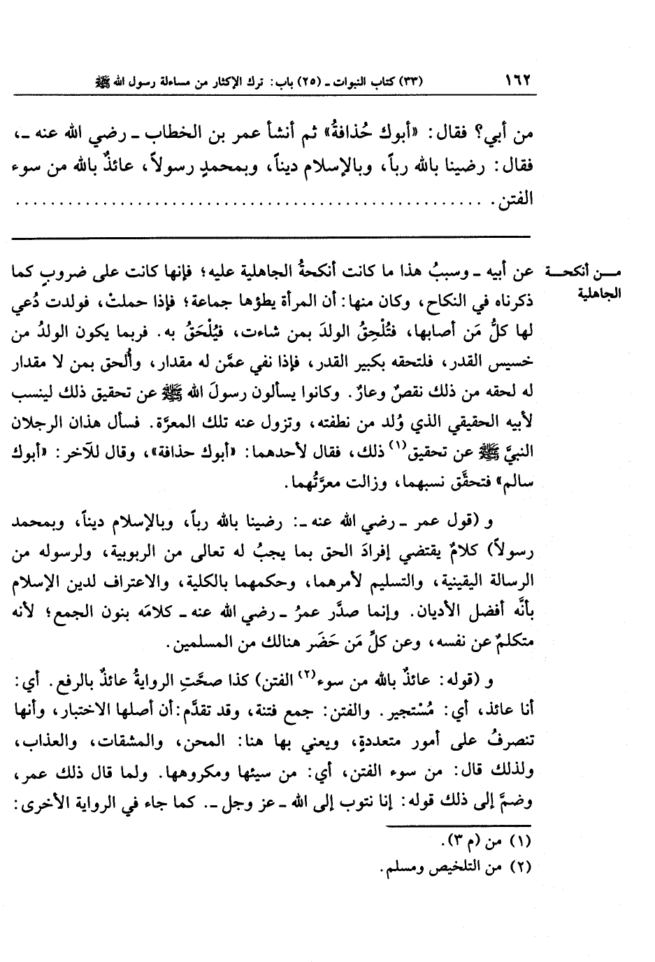 مَن أَبِي؟ قَالَ: أَبُوكَ حُذَافَةُ ثُمَّ أَنشَأَ عُمَرُ بنُ الخَطَّابِ رَضِيَ اللَّهُ عَنهُ فَقَالَ: رَضِينَا بِاللَّهِ رَبًّا، وَبِالإِسلَامِ دِينًا، وَبِمُحَمَّدٍ رَسُولًا، عَائِذ بِاللَّهِ مِن سُوءِ الفِتَنِ،