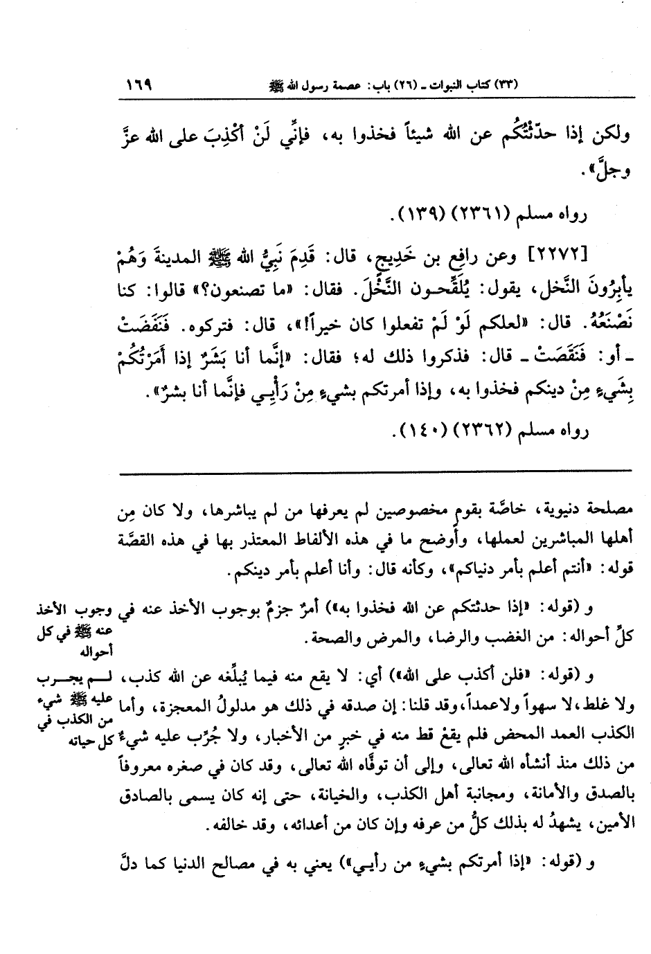 [2272] وعن رَافِعُ بنُ خَدِيجٍ قَالَ قَدِمَ نَبِيُّ اللَّهِ صَلَّى اللَّهُ عَلَيهِ وَسَلَّمَ المَدِينَةَ وَهُم يَأبُرُونَ النَّخلَ يَقُولُ: يُلَقِّحُونَ النَّخلَ فَقَالَ: مَا تَصنَعُونَ؟ قَالُوا: كُنَّا نَصنَعُهُ قَالَ: لَعَلَّكُم لَو لَم تَفعَلُوا كَانَ خَيرًا! قال: فَتَرَكُوهُ فَنَفَضَت - أَو فَنَقَصَت - قَالَ: فَذَكَرُوا ذَلِكَ لَهُ، فَقَالَ: إِنَّمَا أَنَا بَشَرٌ إِذَا أَمَرتُكُم بِشَيءٍ مِن دِينِكُم فَخُذُوا بِهِ، وَإِذَا أَمَرتُكُم بِشَيءٍ مِن رَأييٍ فَإِنَّمَا أَنَا بَشَرٌ.