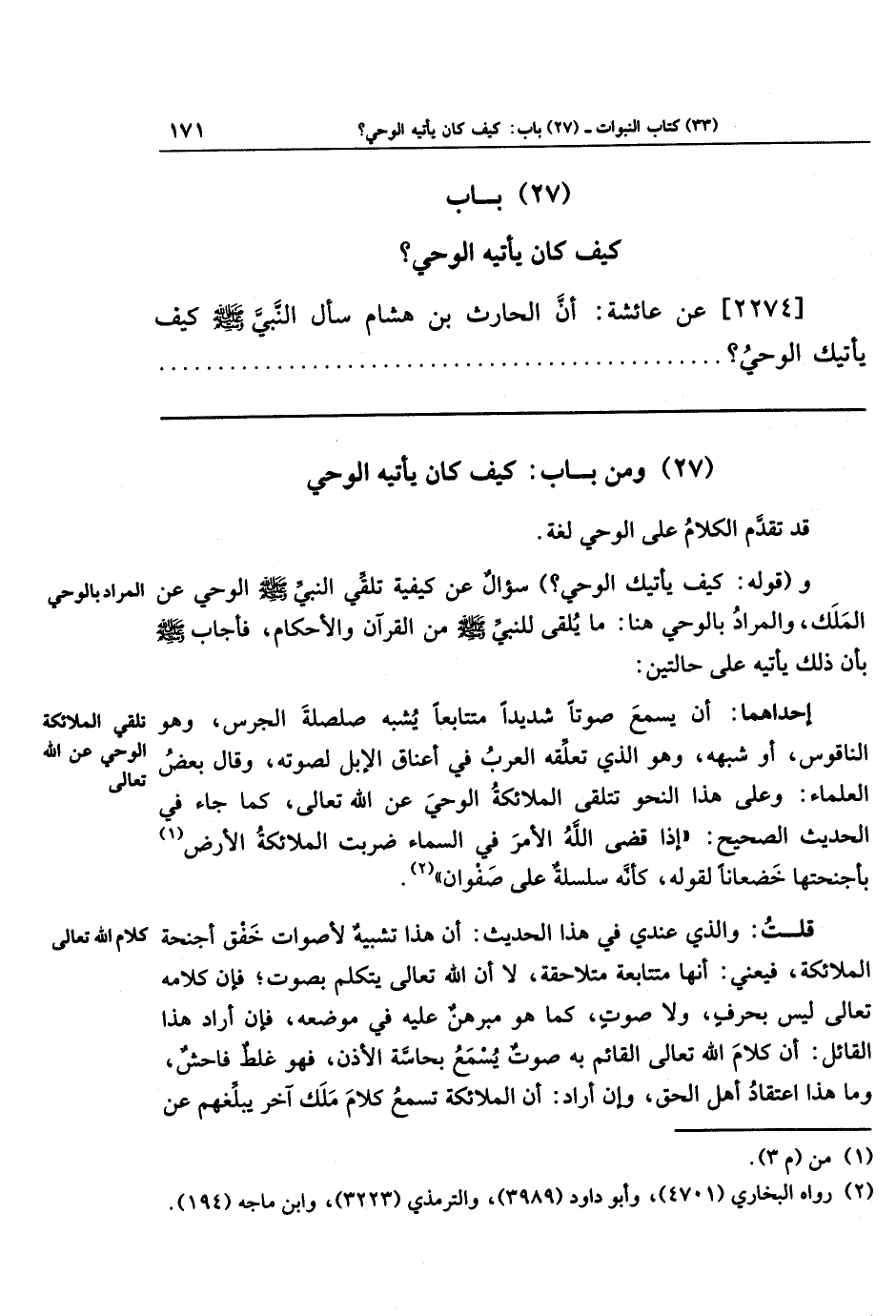 إحداهما: أن يسمع صوتًا شديدًا متتابعًا يشبه صلصلة الجرس، وهو الناقوس، أو شبهه، وهو الذي تعلقه العرب في أعناق الإبل لصوته، وقال بعض العلماء: وعلى هذا النحو تتلقى الملائكة الوحي عن الله تعالى، كما جاء في الحديث الصحيح: إذا قضى الله الأمر في السماء ضربت الملائكة الأرض (¬1) بأجنحتها خَضعانًا لقوله، كأنه سلسلة على صفوان (¬2).