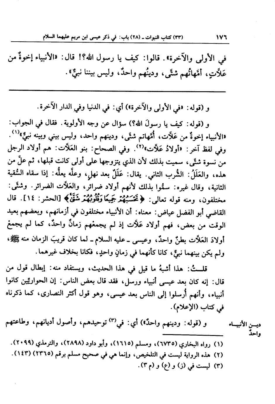 فِي الأُولَى وَالآخِرَةِ قَالُوا: كَيفَ يَا رَسُولَ اللَّهِ؟ قَالَ: الأَنبِيَاءُ إِخوَةٌ مِن عَلَّاتٍ، أُمَّهَاتُهُم شَتَّى، وَدِينُهُم وَاحِدٌ ولَيسَ بَينَنَا نَبِيٌّ.