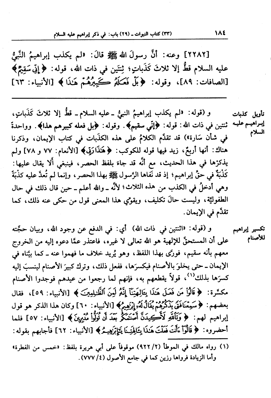 و(قوله: اثنتين في ذات الله) أي: في الدفع عن وجود الله، وبيان حجته على أن المستحق للإلهية هو الله تعالى لا غيره، فاعتذر عمَّا دعوه إليه من الخروج معهم بأنه سقيم، فورى بهذا اللفظ، وهو يريد خلاف ما فهموا عنه - كما بيَّناه في الإيمان - حتى يخلو بالأصنام فيكسرها، ففعل ذلك، وترك كبير الأصنام لينسب إليه كسرها بذلك (¬1)، قولًا يقطعهم به، فإنَّهم لما رجعوا من عيدهم فوجدوا الأصنام مكسَّرة: {قَالُوا مَن فَعَلَ هَذَا بِآلِهَتِنَا إِنَّهُ لَمِنَ الظَّالِمِينَ} فقال بعضهم: {سَمِعنَا فَتًى يَذكُرُهُم يُقَالُ لَهُ إِبرَاهِيمُ} وكان هذا الذكر هو قول إبراهيم لهم: {وَتَاللَّهِ لأَكِيدَنَّ أَصنَامَكُم بَعدَ أَن تُوَلُّوا مُدبِرِينَ} فلما أحضروه: قَالُوا: {أَأَنتَ فَعَلتَ هَذَا بِآلِهَتِنَا يَا إِبرَاهِيمُ} فأجابهم بقوله: