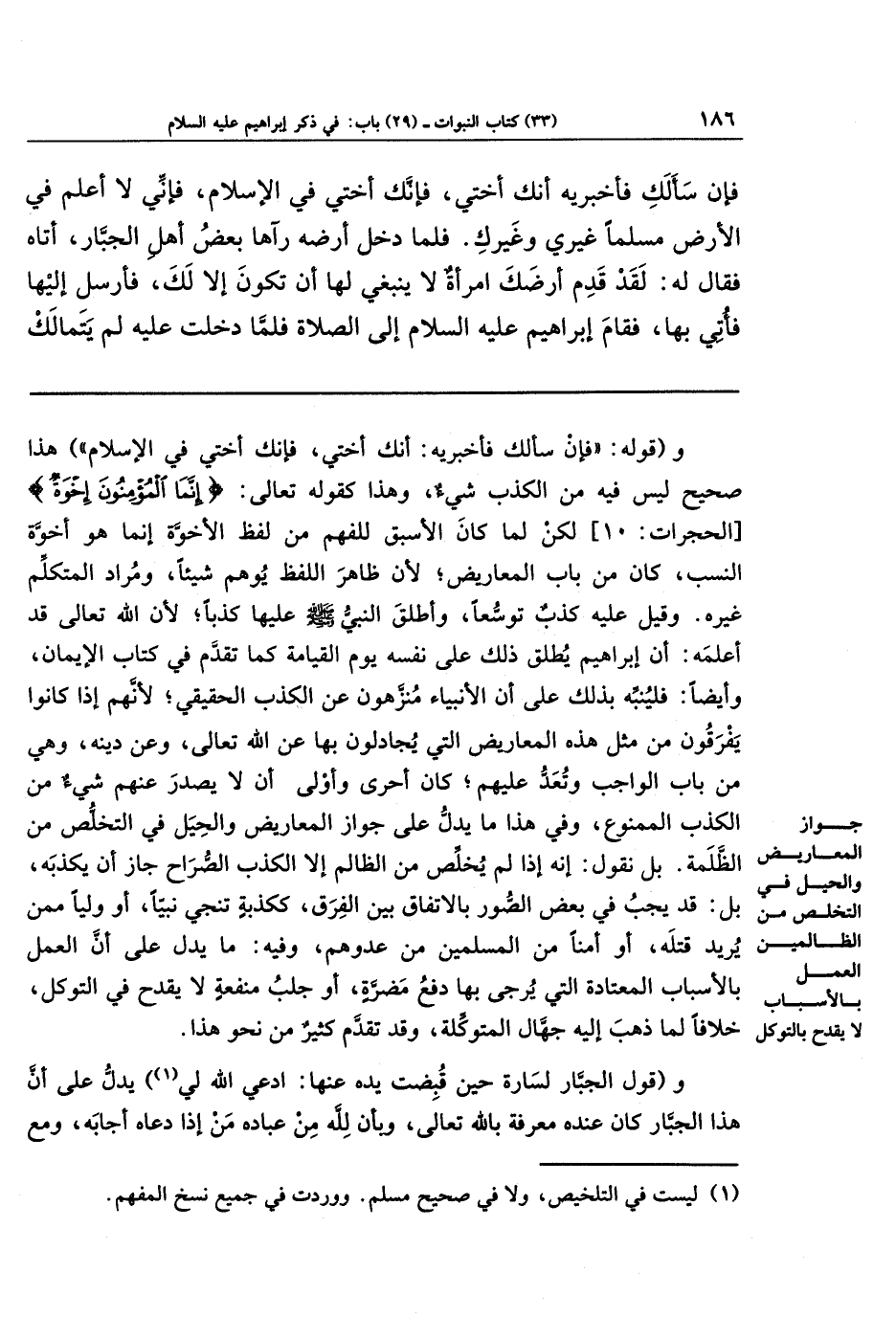 و(قوله: فإنَّ سألك فأخبريه: أنك أختي، فإنك أختي في الإسلام) هذا صحيح ليس فيه من الكذب شيء، وهذا كقوله تعالى: {إِنَّمَا المُؤمِنُونَ إِخوَةٌ} لكن لما كان الأسبق للفهم من لفظ الأخوة إنما هي أخوَّة النسب، كان من باب المعاريض، لأنَّ ظاهر اللفظ يوهم شيئًا، ومراد المتكلم غيره. وقيل عليه كذب توسُّعًا، وأطلق النبي ـ صلى الله عليه وسلم ـ عليها كذبًا، لأنَّ الله تعالى قد أعلمه: أن إبراهيم يطلق ذلك على نفسه يوم القيامة كما تقدم في كتاب الإيمان، وأيضًا: فليُنبَّه بذلك على أن الأنبياء منزهون عن الكذب الحقيقي، لأنَّهم إذا كانوا يَفرَقُون من مثل هذه المعاريض التي يجادلون بها عن الله تعالى، وعن دينه، وهي من باب الواجب وتعد عليهم، كان أحرى وأولى أن لا يصدر عنهم شيء من الكذب الممنوع، وفي هذا ما يدلّ على جواز المعاريض والحيل في التخلص من الظَّلمة. بل نقول: إنه إذا لم يُخلِّص من الظالم إلا الكذب الصَّراح جاز أن يكذبَه، بل قد يجب في بعض الصور بالاتفاق بين الفِرَق، ككذبة تنجي نبيًّا، أو وليًّا ممن يُريد قتله، أو أمنًا من المسلمين من عدوهم.