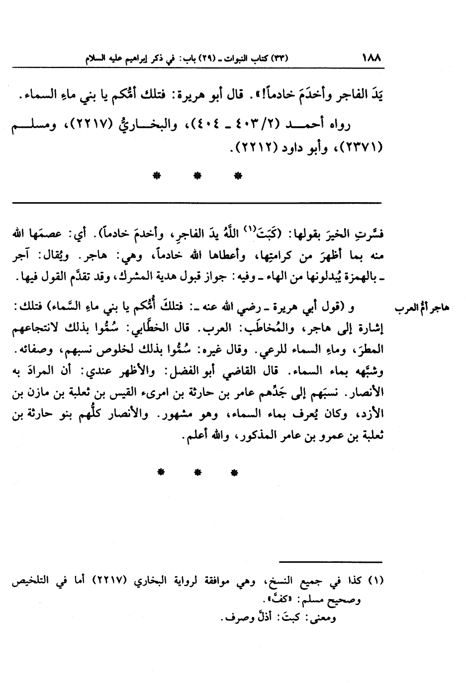 وقول أبي هريرة ـ رضي الله عنه ـ: فتلك أُمُّكم يا بني ماء السَّماء، فتلك: إشارة إلى هاجر، والمخاطب: العرب. قال الخطابي: سُمُّوا بذلك لانتجاعهم المطر، وماء السماء للرعي. وقال غيره: سُمُّوا بذلك لخلوص نسبهم، وصفائه. وشبَّهه بماء السماء. قال القاضي أبو الفضل: والأظهر عندي: أن المراد به الأنصار. نسبهم إلى جَدِّهم عامر بن حارثة بن امرئ القيس بن ثعلبة بن مازن بن الأزد، وكان يعرف بماء السماء، وهو مشهور. والأنصار كلهم بنو حارثة بن ثعلبة بن عمرو بن عامر المذكور، والله أعلم.