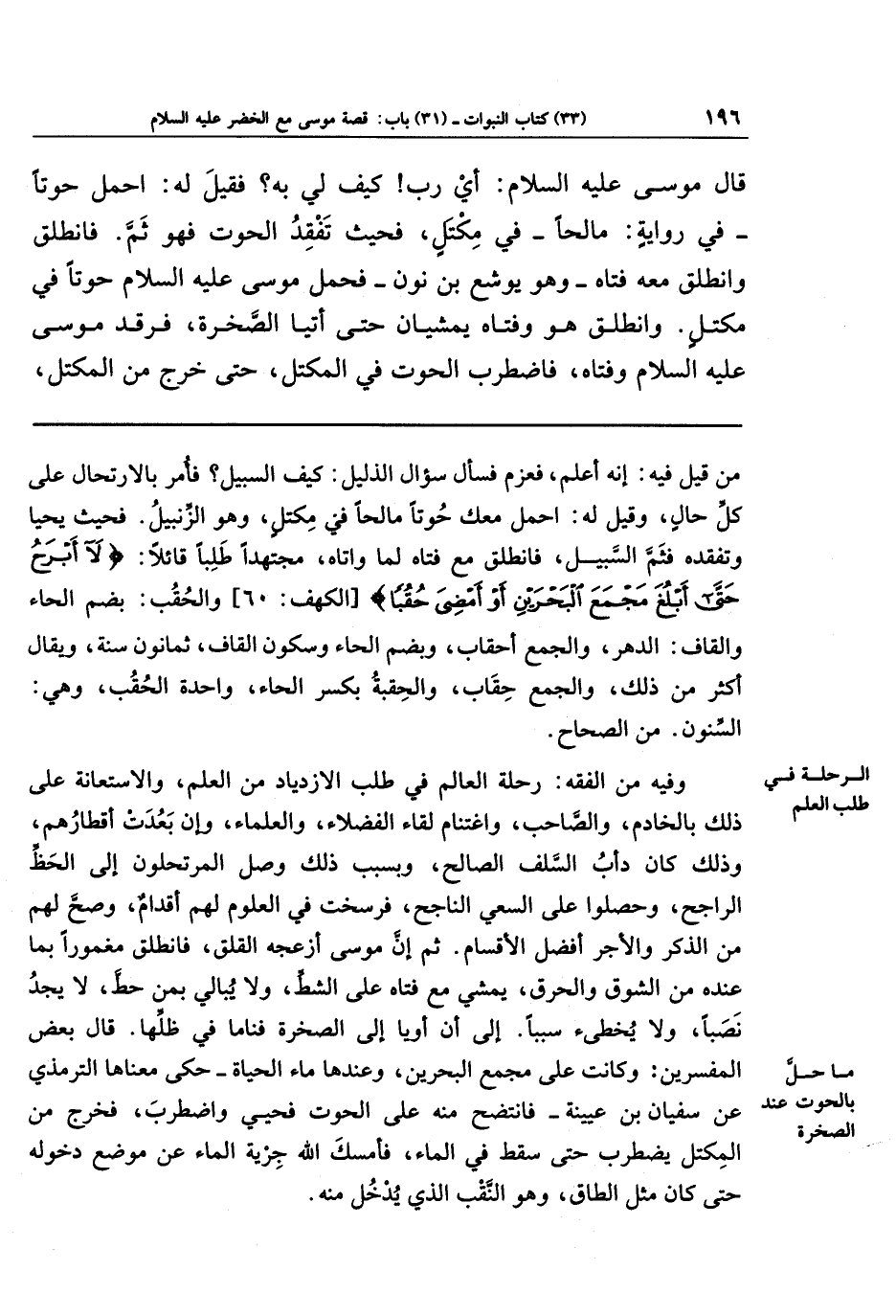وفيه من الفقه: رحلة العالم في طلب الازدياد من العلم، والاستعانة على ذلك بالخادم، والصَّاحب، واغتنام لقاء الفضلاء، والعلماء، وإن بَعُدَت أقطارهم، وذلك كان دأب السَّلف الصالح، وبسبب ذلك وصل المرتحلون إلى الحظ الراجح، وحصلوا على السعي الناجح، فرسخت في العلوم لهم أقدام، وصحَّ لهم من الذكر والأجر أفضل الأقسام. ثم إن موسى أزعجه القلق، فانطلق مغمورًا بما عنده من الشوق والحرق، يمشي مع فتاه على الشط، ولا يبالي بمن حطَّ، لا يجد نصبًا، ولا يخطئ سببًا. إلى أن أويا إلى الصخرة فناما في ظِلِّها. قال بعض المفسرين: وكانت على مجمع البحرين، وعندها ماء الحياة - حكى معناها الترمذي عن سفيان بن عيينة - فانتضح منه على الحوت فحيي واضطرب، فخرج من المكتل يضطرب حتى سقط في الماء، فأمسك الله جرية الماء عن موضع دخوله حتى كان مثل الطاق، وهو النَّقب الذي يدخل منه.