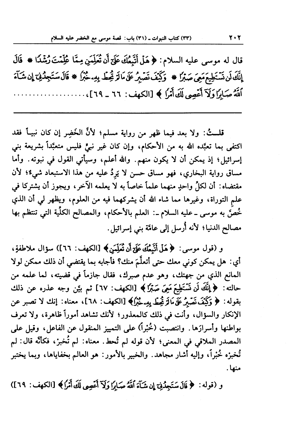 قلت: ولا بعد فيما ظهر من رواية مسلم، لأنَّ الخضر إن كان نبيًا فقد اكتفى بما تعبَّده الله به من الأحكام، وإن كان غير نبي فليس متعبدًا بشريعة بني إسرائيل، إذ يمكن أن لا يكون منهم. والله أعلم، وسيأتي القول في نبوته. وأما مساق رواية البخاري، فهو مساق حسن لا يرد عليه من هذا الاستبعاد شيء، لأنَّ مقتضاه: أن لكل واحد منهما علما خاصا به لا يعلمه الآخر، ويجوز أن يشتركا في علم التوراة، وغيرها مما شاء الله أن يشركهما فيه من العلوم، ويظهر لي أن الذي خصَّ به موسى ـ عليه السلام ـ: العلم بالأحكام، والمصالح الكلية التي تنتظم بها مصالح الدنيا، لأنَّه أرسل إلى عامة بني إسرائيل.