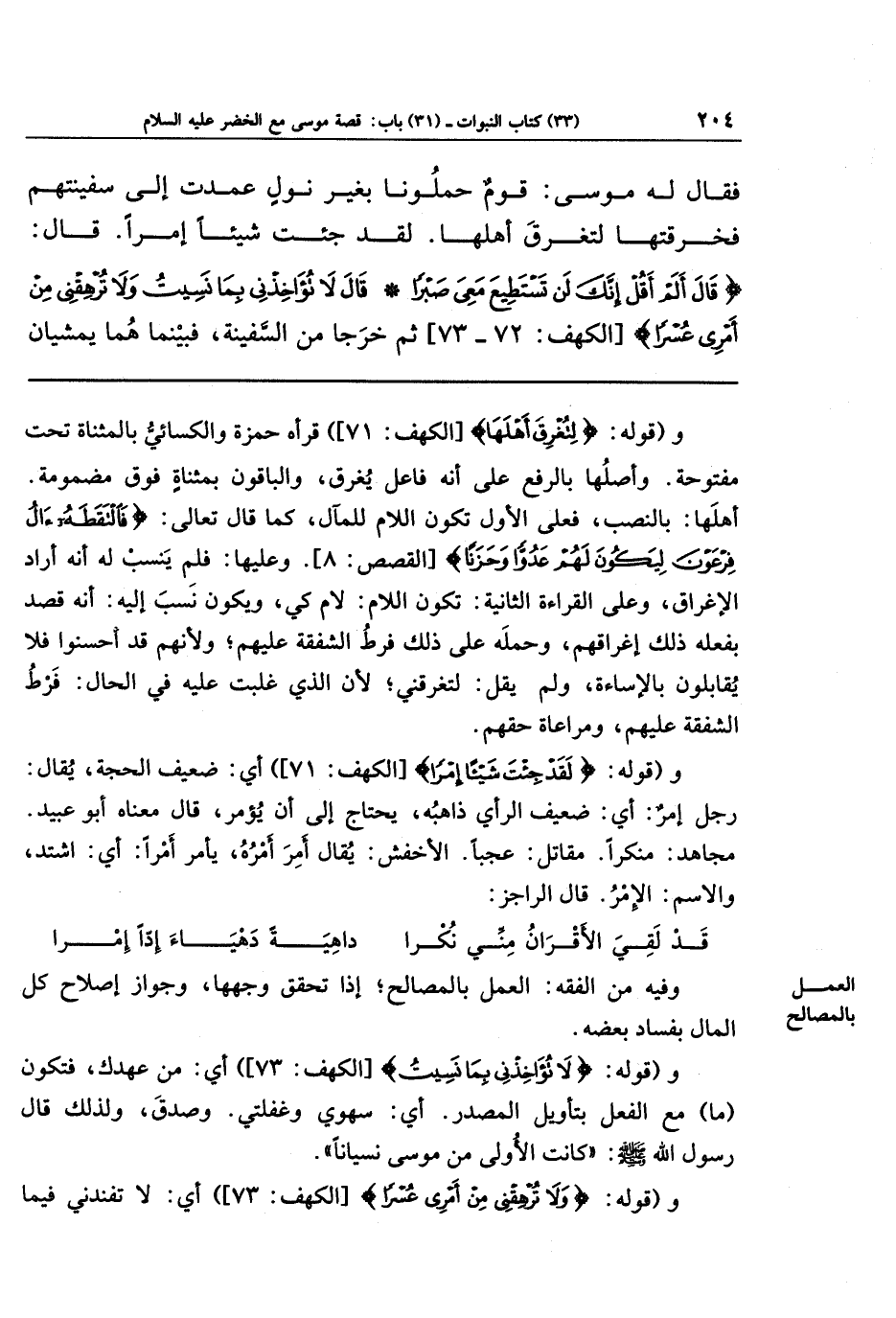فَقَالَ لَهُ مُوسَى: قَومٌ حَمَلُونَا بِغَيرِ نَولٍ عَمَدتَ إِلَى سَفِينَتِهِم فَخَرَقتَهَا لِتُغرِقَ أَهلَهَا لَقَد جِئتَ شَيئًا إِمرًا، قَالَ: {قَالَ أَلَم أَقُل إِنَّكَ لَن تَستَطِيعَ مَعِيَ صَبرًا * قَالَ لا تُؤَاخِذنِي بِمَا نَسِيتُ وَلا تُرهِقنِي مِن أَمرِي عُسرًا} ثُمَّ خَرَجَا مِن السَّفِينَةِ، فَبَينَمَا هُمَا يَمشِيَانِ