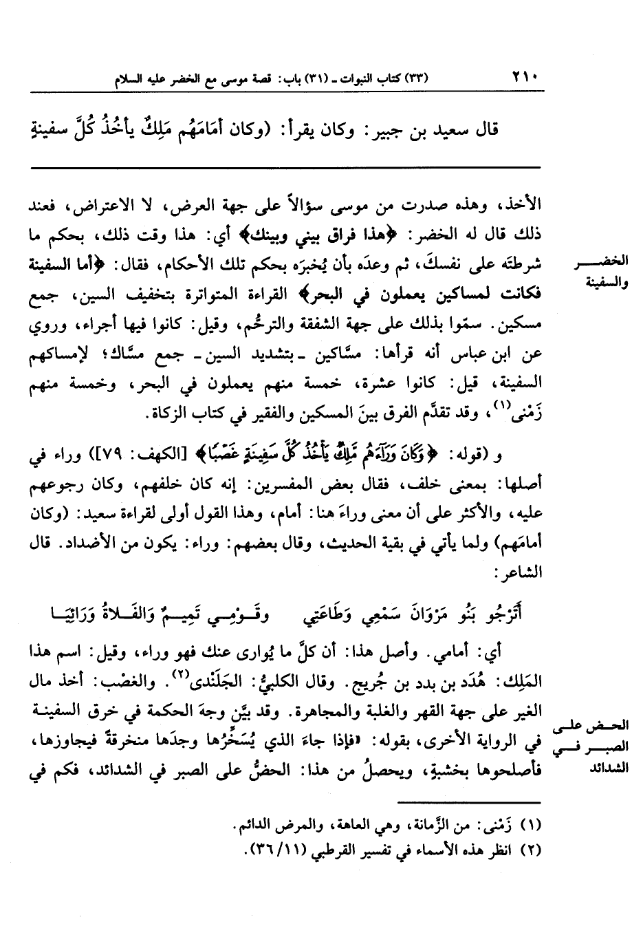 أي: أمامي. وأصل هذا: أن كل ما يوارى عنك فهو وراء، وقيل: اسم هذا المَلِك: هدد بن بدد بن جُريج. وقال الكلبيُّ: الجَلَندى (¬2). والغصب: أخذ مال الغير على جهة القهر والغلبة والمجاهرة. وقد بيَّن وجهَ الحكمة في خرق السفينة في الرواية الأخرى بقوله: فإذا جاءَ الذي يُسَخِّرُها وجدَها منخرقةً فيجاوزها، فأصلحوها بخشبةٍ، ويحصلُ من هذا: الحضُّ على الصبر في الشدائد، فكم في