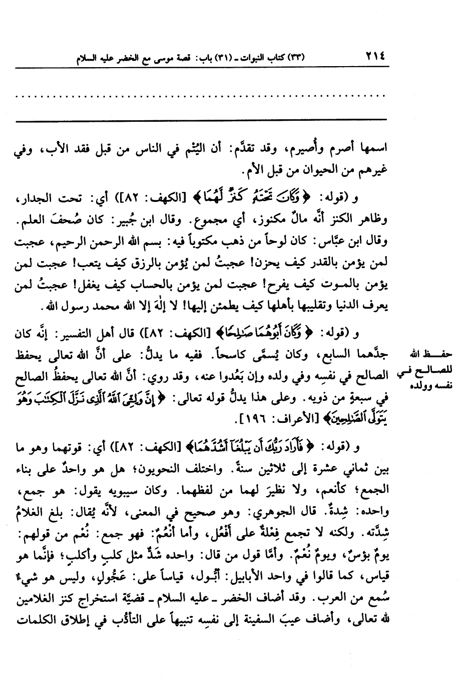وقوله: {وَكَانَ أَبُوهُمَا صَالِحًا} قال أهل التفسير: إنه كان جدَّهما السابع، وكان يُسمَّى كاسحًا. ففيه ما يدلّ: على أن الله تعالى يحفظ الصالح في نفسه وفي ولده وإن بَعُدوا عنه، وقد روي: أن الله تعالى يحفظ الصالح في سبعة من ذويه. وعلى هذا يدل قوله تعالى: {إِنَّ وَلِيِّيَ اللَّهُ الَّذِي نَزَّلَ الكِتَابَ وَهُوَ يَتَوَلَّى الصَّالِحِينَ}