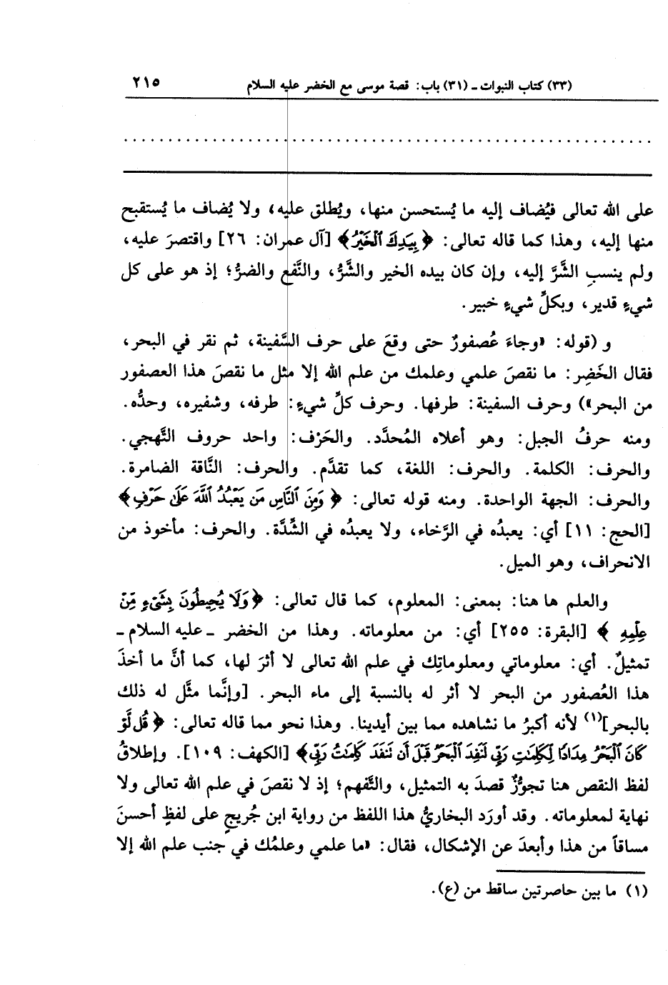 و(قوله: وجاء عصفورٌ حتى وقع على حرف السَّفينة، ثم نقر في البحر، فقال الخضر: ما نقص علمي وعلمك من علم الله إلا مثل ما نقص هذا العصفور من البحر) وحرف السفينة: طرفها. وحرف كل شيء: طرفه، وشفيره، وحدُّه. ومنه حرف الجبل: وهو أعلاه المحدَّد. والحرف: واحد حروف التَّهجي. والحرف: الكلمة. والحرف: اللغة، كما تقدَّم. والحرف: الناقة الضامرة. والحرف: الجهة الواحدة. ومنه قوله تعالى: {وَمِنَ النَّاسِ مَن يَعبُدُ اللَّهَ عَلَى حَرفٍ} أي: يعبده في الرَّخاء، ولا يعبده في الشدَّة. والحرف: مأخوذ من الانحراف، وهو الميل.