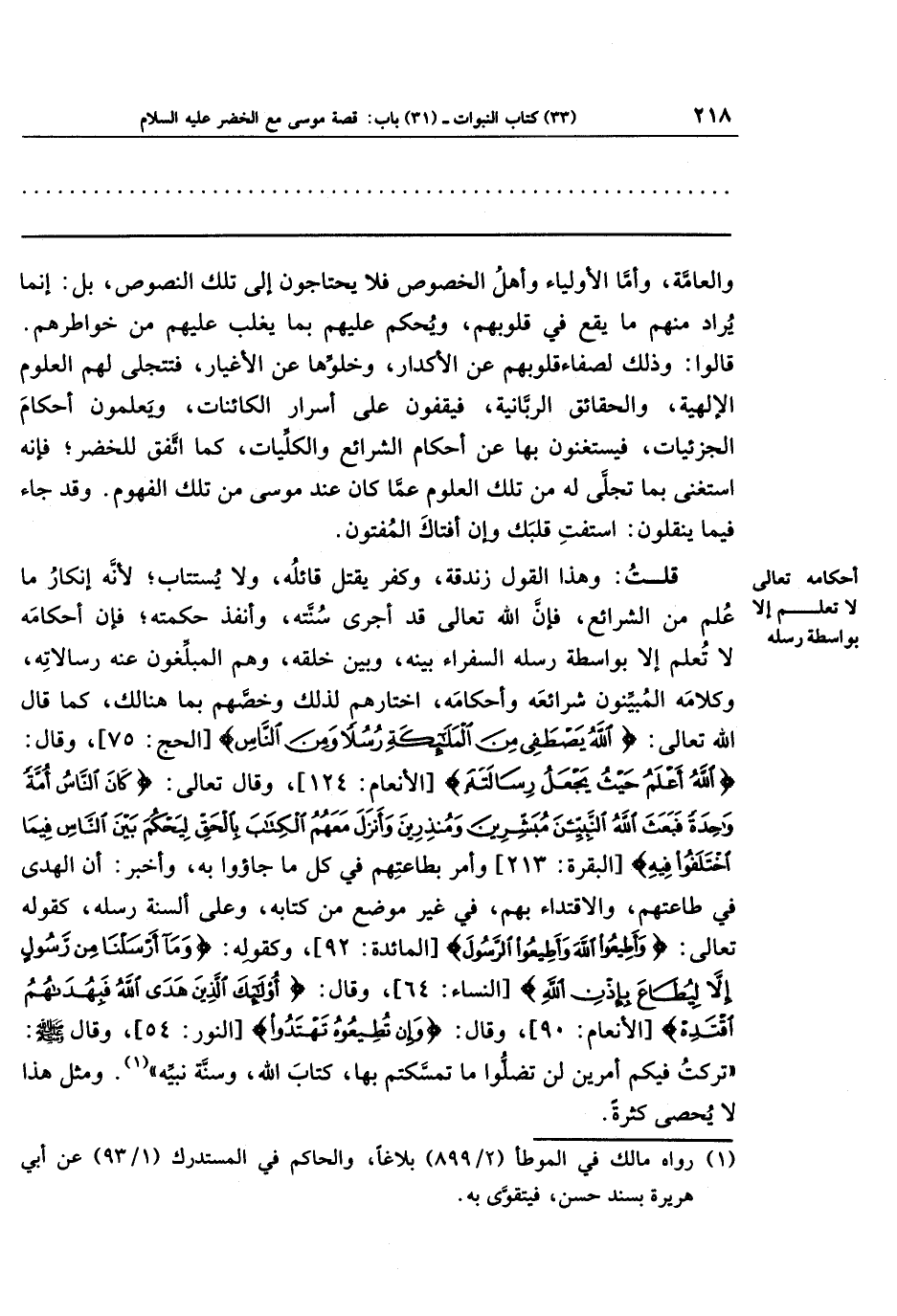 والعامة، وأما الأولياء وأهل الخصوص فلا يحتاجون إلى تلك النصوص، بل: إنما يراد منهم ما يقع في قلوبهم، ويحكم عليهم بما يغلب عليهم من خواطرهم. قالوا: وذلك لصفاء قلوبهم عن الأكدار، وخلوّها عن الأغيار، فتتجلى لهم العلوم الإلهية، والحقائق الربانية، فيقفون على أسرار الكائنات، ويعلمون أحكام الجزئيات، فيستغنون بها عن أحكام الشرائع والكليات، كما اتَّفق للخضر، فإنَّه استغنى بما تجلى له من تلك العلوم عما كان عند موسى من تلك الفهوم. وقد جاء فيما ينقلون: استفت قلبك وإن أفتاك المفتون.