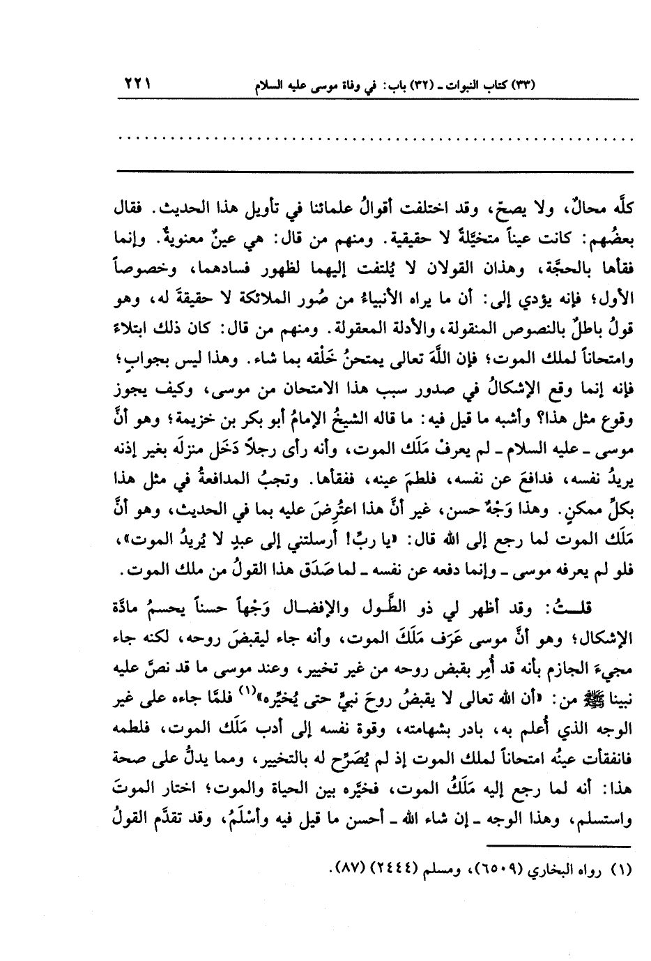 وقد اختلفت أقوال علمائنا في تأويل هذا الحديث. فقال بعضهم: كانت عينًا متخيَّلة لا حقيقية. ومنهم من قال: هي عين معنوية. وإنما فقأها بالحجَّة، وهذان القولان لا يلتفت إليهما لظهور فسادهما، وخصوصًا الأول، فإنَّه يؤدي إلى: أن ما يراه الأنبياء من صور الملائكة لا حقيقة له، وهو قول باطل بالنصوص المنقولة، والأدلة المعقولة. ومنهم من قال: كان ذلك ابتلاء وامتحانًا لملك الموت، فإنَّ الله تعالى يمتحن خلقه بما شاء. وهذا ليس بجواب، فإنَّه إنما وقع الإشكال في صدور سبب هذا الامتحان من موسى، وكيف يجوز وقوع مثل هذا؟ وأشبه ما قيل فيه: ما قاله الشيخ الإمام أبو بكر بن خزيمة، وهو أن موسى ـ عليه السلام ـ لم يعرف ملك الموت، وأنه رأى رجلًا دخل منزله بغير إذنه يريد نفسه، فدافع عن نفسه، فلطم عينه، ففقأها. وتجب المدافعة في مثل هذا بكل ممكن. وهذا وجه حسن، غير أن هذا اعترض عليه بما في الحديث، وهو أن ملك الموت لما رجع إلى الله قال: يا رب! أرسلتني إلى عبد لا يريد الموت، فلو لم يعرفه موسى - وإنما دفعه عن نفسه - لما صدق هذا القول من ملك الموت.