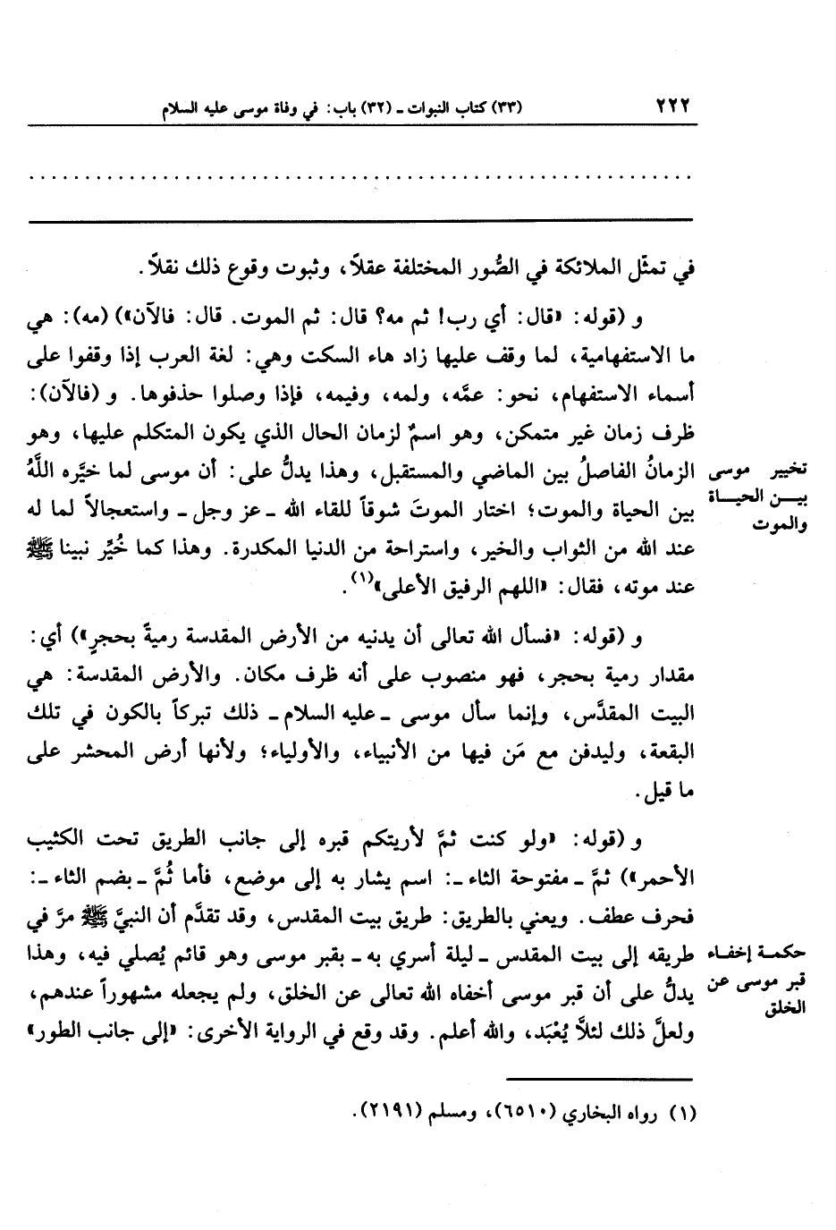 و(قوله: قال: أي رب! ثم مه؟ قال؟ ثم الموت. قال: فالآن) مه: هي ما الاستفهامية، لما وقف عليها زاد هاء السكت وهي: لغة العرب إذا وقفوا على أسماء الاستفهام، نحو: عمه، ولمه، وفيمه، فإذا وصلوا حذفوها. وفالآن: ظرف زمان غير متمكن، وهو اسم لزمان الحال الذي يكون المتكلم عليها، وهو الزمان الفاصل بين الماضي والمستقبل، وهذا يدلّ على: أن موسى لما خيَّره الله بين الحياة والموت، اختار الموت شوقًا للقاء الله عز وجل، واستعجالًا لما له عند الله من الثواب والخير، واستراحة من الدنيا المكدرة. وهذا كما خُيِّر نبينا ـ صلى الله عليه وسلم ـ عند موته، فقال: اللهم الرفيق الأعلى (¬1).