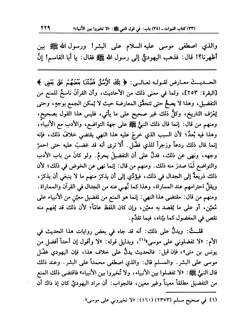 الحديث معارض لقوله تعالى: {تِلكَ الرُّسُلُ فَضَّلنَا بَعضَهُم عَلَى بَعضٍ} ولِمَا في معنى ذلك من الأحاديث، وأن القرآن ناسخ للمنع من التفضيل، وهذا لا يصح حتى تتحقق المعارضة حيث لا يمكن الجمع بوجه، وحتى يُعرف التاريخ، وكل ذلك غير صحيح على ما يأتي، فليس هذا القول بصحيح، ومنهم من قال: إنما قال ذلك النبي ـ صلى الله عليه وسلم ـ على جهة التواضع، والأدب مع الأنبياء، وهذا فيه بُعد، لأنَّ السبب الذي خرج عليه هذا النهي يقتضي خلاف ذلك، فإنَّه إنما قال ذلك ردعًا وزجرًا للذي فضَّل. ألا ترى أنه قد غضب عليه حتى احمر وجهه، ونهى عن ذلك، فدلَّ على أن التفضيل يحرم. ولو كان من باب الأدب والتواضع لما صدر منه ذلك. ومنهم من قال: إنما نهى عن الخوض في ذلك، لأنَّ ذلك ذريعة إلى الجدال في ذلك، فيؤدي إلى أن يذكر منهم ما لا ينبغي أن يذكر، ويقل احترامهم عند المماراة، وهذا كما نهي عنه من الجدال في القرآن والمماراة. ومنهم من قال: مقتضى هذا النهي: إنما هو المنع من تفضيل معيَّن من الأنبياء على معيَّن، أو على ما يقصد به معيَّن، وإن كان اللفظ عامًا، لأنَّ ذلك قد يفهم منه نقص في المفضول كما بيَّنَّاه، فيما تقدَّم.