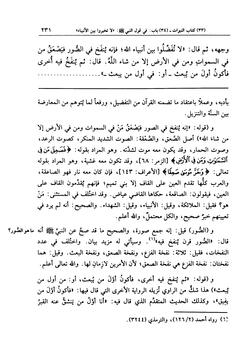 وَجهِهِ، ثُمَّ قَالَ: لَا تُفَضِّلُوا بَينَ أَنبِيَاءِ اللَّهِ، فَإِنَّهُ يُنفَخُ فِي الصُّورِ فَيَصعَقُ مَن فِي السَّمَاوَاتِ وَمَن فِي الأَرضِ إِلَّا مَن شَاءَ اللَّهُ، قَالَ: ثُمَّ يُنفَخُ فِيهِ أُخرَى، فَأَكُونُ أَوَّلَ مَن يبعثَ - أَو: فِي أَوَّلِ مَن يبعثَ -