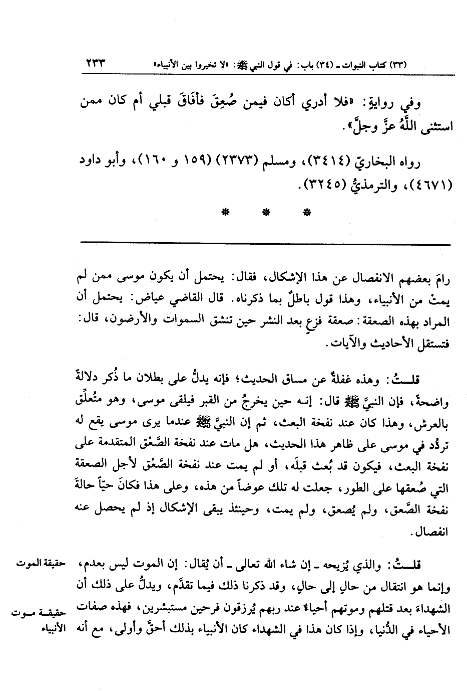 رام بعضهم الانفصال عن هذا الإشكال، فقال: يحتمل أن يكون موسى ممن لم يمت من الأنبياء، وهذا قول باطل بما ذكرناه. قال القاضي عياض: يحتمل أن المراد بهذه الصعقة: صعقة فزع بعد النشر حين تنشق السماوات والأرضون، قال: فتستقل الأحاديث والآيات.