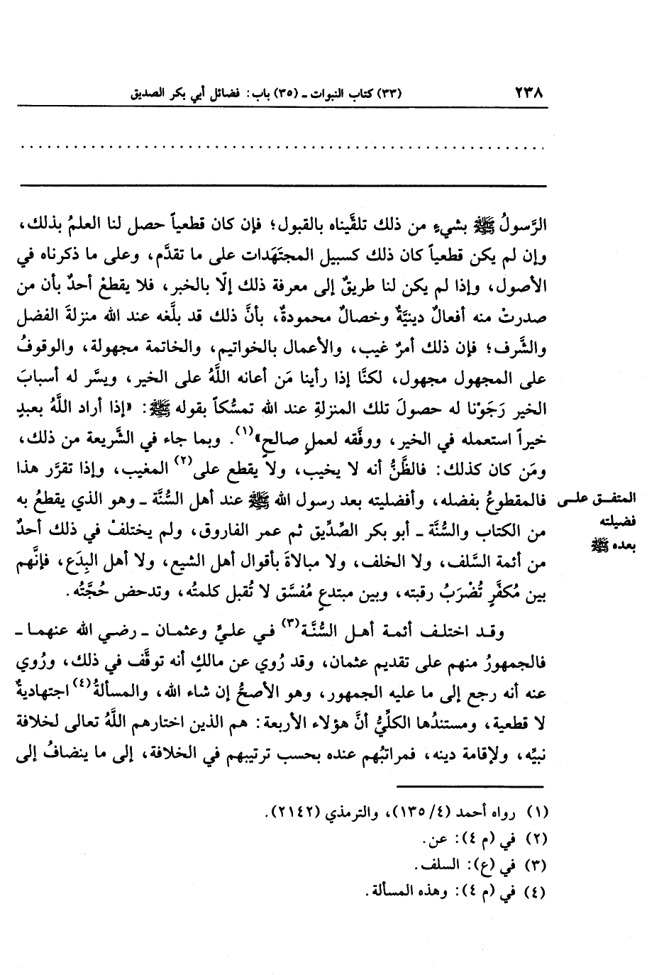 وقد اختلف أئمة أهل السُّنَّة (¬3) في علي وعثمان رضي الله عنهما، فالجمهور منهم على تقديم عثمان، وقد روي عن مالك أنه توقف في ذلك، وروي عنه أنه رجع إلى ما عليه الجمهور، وهو الأصح إن شاء الله، والمسألة (¬4) اجتهادية لا قطعية، ومستندها الكلِّي أن هؤلاء الأربعة: هم الذين اختارهم الله تعالى لخلافة نبيَّه، ولإقامة دينه، فمراتبهم عنده بحسب ترتيبهم في الخلافة، إلى ما ينضافُ إلى