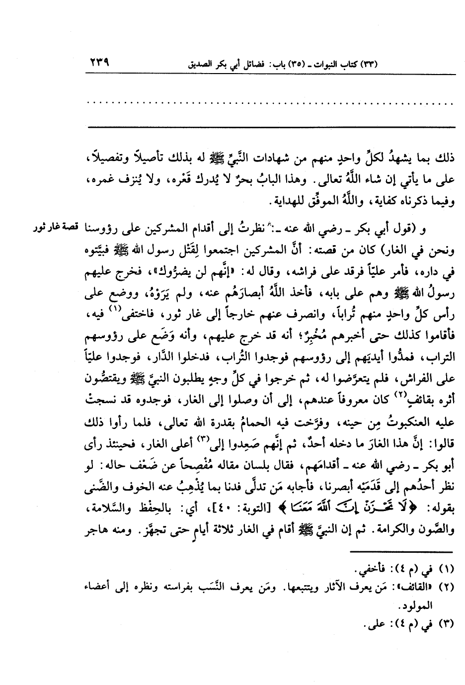 وقول أبي بكر ـ رضي الله عنه ـ: نظرت إلى أقدام المشركين على رؤوسنا ونحن في الغار كان من قصته: أن المشركين اجتمعوا لقتل رسول الله ـ صلى الله عليه وسلم ـ، فبيتوه في داره، فأمر عليًّا فرقد على فراشه، وقال له: إنهم لن يضروك، فخرج عليهم رسول الله ـ صلى الله عليه وسلم ـ وهم على بابه، فأخذ الله أبصارهم عنه، ولم يروه، ووضع على رأس كل واحد منهم ترابًا، وانصرف عنهم خارجًا إلى غار ثور، فاختفى (¬1) فيه، فأقاموا كذلك حتى أخبرهم مُخبِرٌ أنه قد خرج عليهم، وأنه وضع على رؤوسهم التراب، فمدُّوا أيديهم إلى رؤوسهم فوجدوا التراب، فدخلوا الدَّار، فوجدوا عليًّا على الفراش، فلم يتعرضوا له، ثم خرجوا في كل وجه يطلبون النبي ـ صلى الله عليه وسلم ـ ويقتصون أثره بقائف (¬2) كان معروفًا عندهم، إلى أن وصلوا إلى الغار، فوجدوه قد نسجت عليه العنكبوت من حينه، وفرَّخت فيه الحمام بقدرة الله تعالى، فلما رأوا ذلك قالوا: إن هذا الغار ما دخله أحدٌ، ثم إنهم صَعِدوا إلى (¬3) أعلى الغار، فحينئذ رأى أبو بكر ـ رضي الله عنه ـ أقدامهم، فقال بلسان مقاله مفصحًا عن ضعف حاله: لو نظر أحدهم إلى قدميه أبصرنا، فأجابه من تدلَّى فدنا بما يُذهب عنه الخوف والضَّنى بقوله: {لا تَحزَن إِنَّ اللَّهَ مَعَنَا} أي: بالحفظ والسلامة، والصَّون والكرامة. ثم إن النبي ـ صلى الله عليه وسلم ـ أقام في الغار ثلاثة أيام حتى تجهَّز. ومنه هاجر