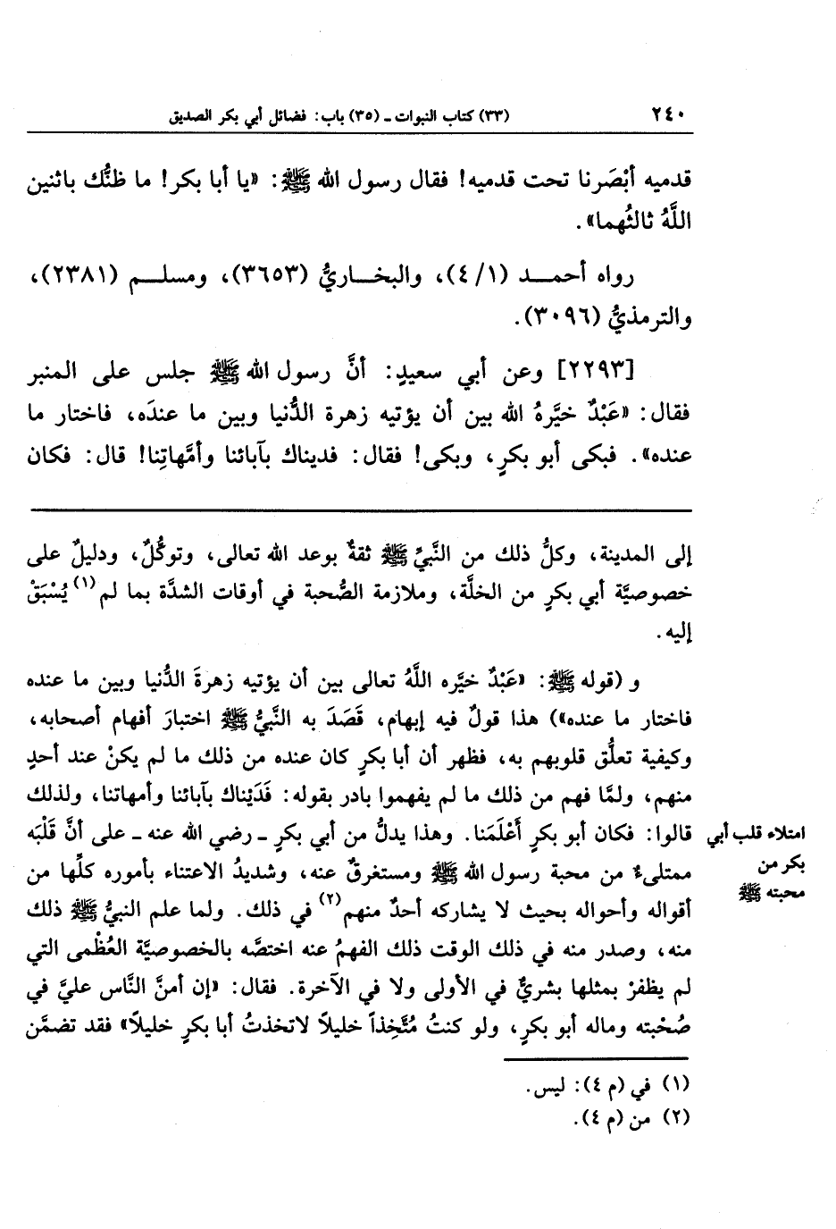 [2293] وعَن أَبِي سَعِيدٍ أَنَّ رَسُولَ اللَّهِ صَلَّى اللَّهُ عَلَيهِ وَسَلَّمَ جَلَسَ عَلَى المِنبَرِ فَقَالَ: عَبدٌ خَيَّرَهُ اللَّهُ بَينَ أَن يُؤتِيَهُ زَهرَةَ الدُّنيَا، وَبَينَ مَا عِندَهُ فَاختَارَ مَا عِندَهُ فَبَكَى أَبُو بَكرٍ وَبَكَى فَقَالَ: فَدَينَاكَ بِآبَائِنَا وَأُمَّهَاتِنَا! قَالَ: فَكَانَ
