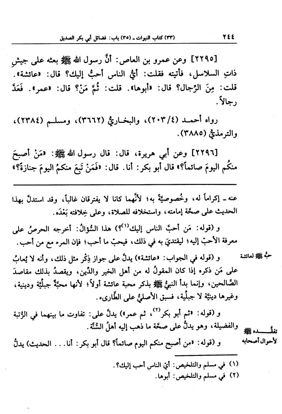 [2295] وعن عَمرُو بنُ العَاصِ أَنَّ رَسُولَ اللَّهِ صَلَّى اللَّهُ عَلَيهِ وَسَلَّمَ بَعَثَهُ عَلَى جَيشِ ذَاتِ السَّلَاسِلِ فَأَتَيتُهُ فَقُلتُ: أَيُّ النَّاسِ أَحَبُّ إِلَيكَ؟ قَالَ: عَائِشَةُ، قُلتُ: مِن الرِّجَالِ؟ قَالَ: أَبُوهَا. قُلتُ: ثُمَّ مَن؟ قَالَ: عُمَرُ. فَعَدَّ رِجَالًا.