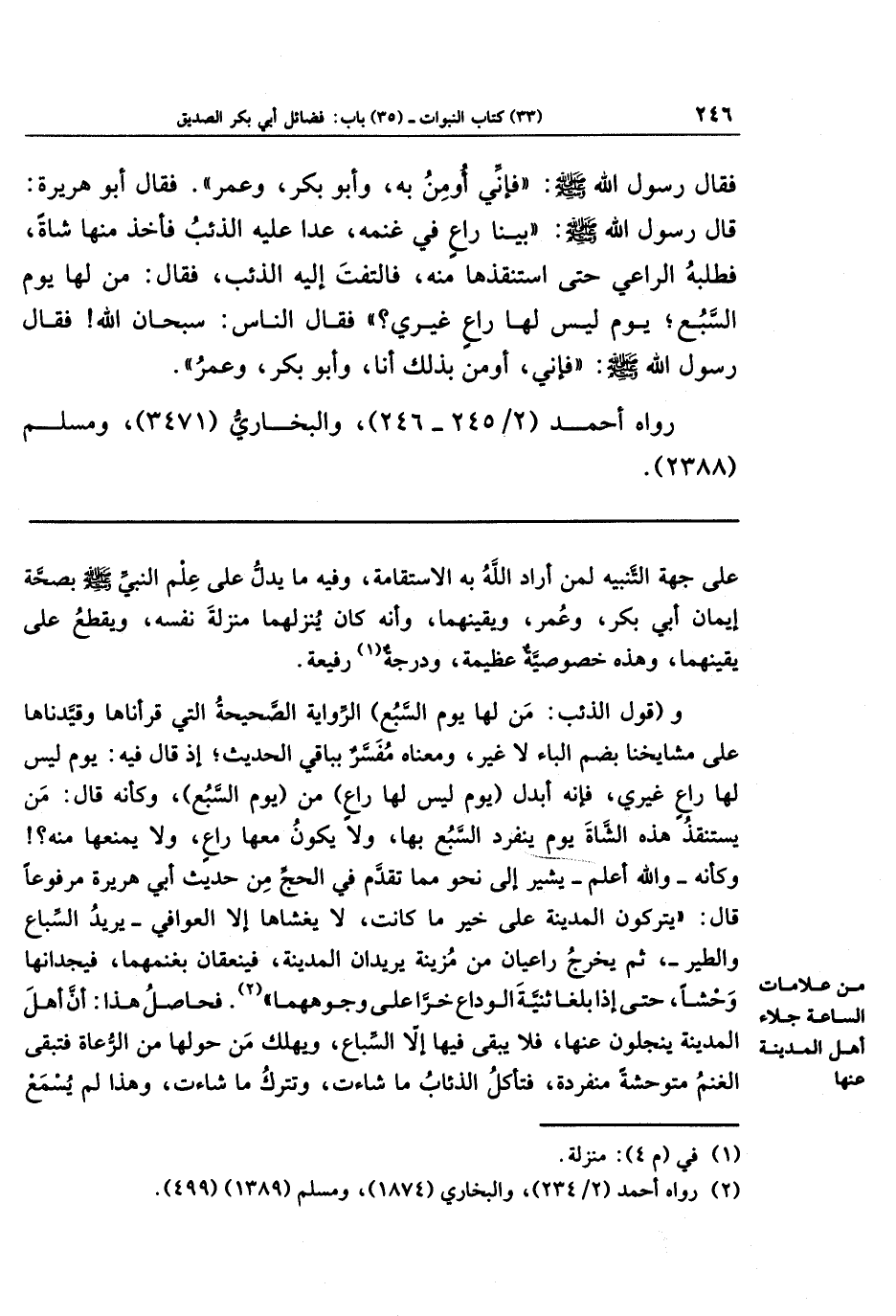 فَقَالَ رَسُولُ اللَّهِ صَلَّى اللَّهُ عَلَيهِ وَسَلَّمَ: فَإِنِّي أُومِنُ بِهِ وَأَبُو بَكرٍ وَعُمَرُ، فقَالَ أَبُو هُرَيرَةَ: قَالَ رَسُولُ اللَّهِ صَلَّى اللَّهُ عَلَيهِ وَسَلَّمَ: بَينَا رَاعٍ فِي غَنَمِهِ عَدَا عَلَيهِ الذِّئبُ، فَأَخَذَ مِنهَا شَاةً، فَطَلَبَهُ الرَّاعِي حَتَّى استَنقَذَهَا مِنهُ، فَالتَفَتَ إِلَيهِ الذِّئبُ، فَقَالَ لَهُ: مَن لَهَا يَومَ السَّبُعِ يَومَ لَيسَ لَهَا رَاعٍ غَيرِي؟ فَقَالَ النَّاسُ: سُبحَانَ اللَّهِ! فَقَالَ رَسُولُ اللَّهِ صَلَّى اللَّهُ عَلَيهِ وَسَلَّمَ: فَإِنِّي أُومِنُ بِذَلِكَ أَنَا وَأَبُو بَكرٍ وَعُمَرُ.