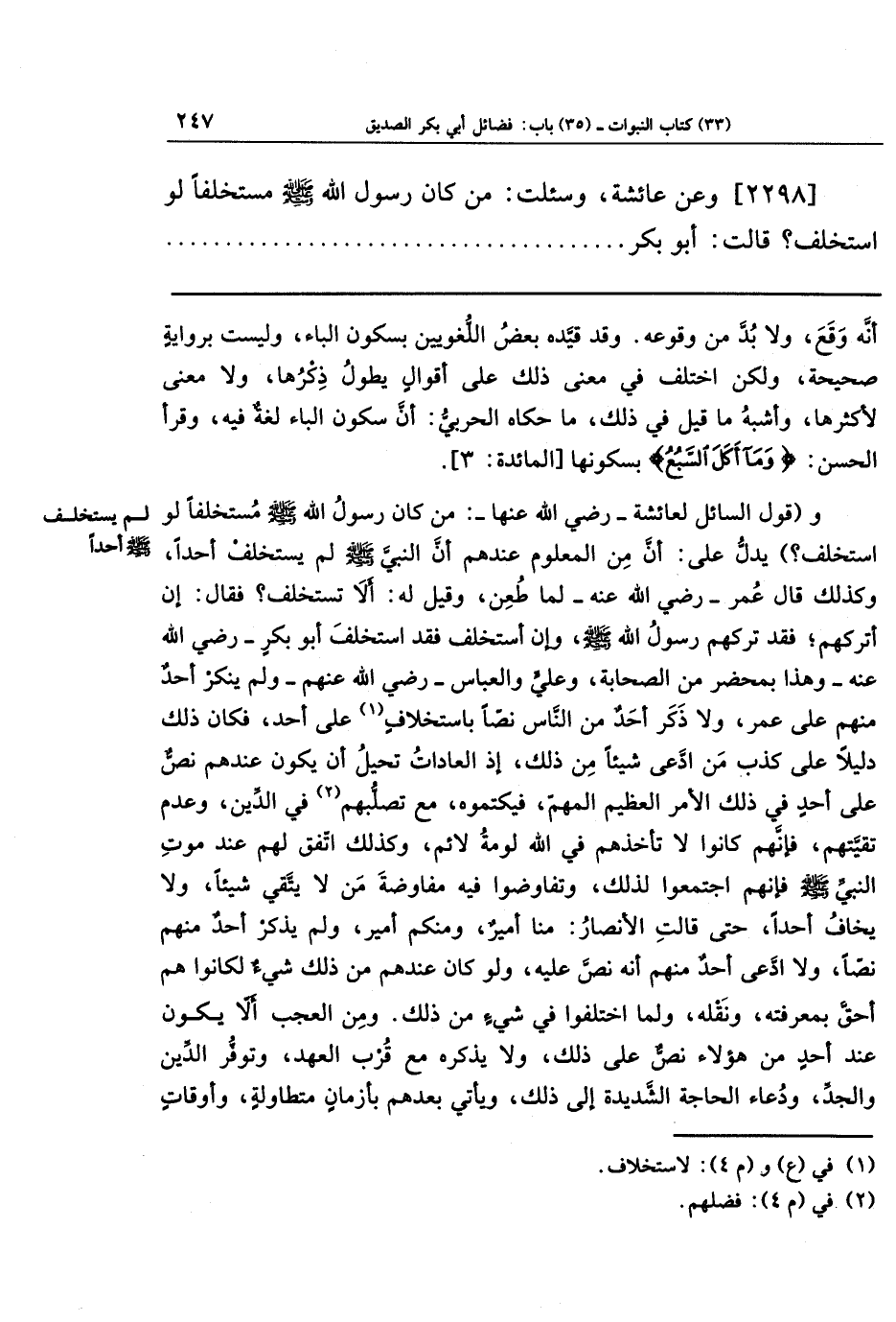 [2298] وعن عَائِشَةَ وَسُئِلَت: مَن كَانَ رَسُولُ اللَّهِ صَلَّى اللَّهُ عَلَيهِ وَسَلَّمَ مُستَخلِفًا لَو استَخلَفَ؟ قَالَت: أَبُو بَكرٍ،