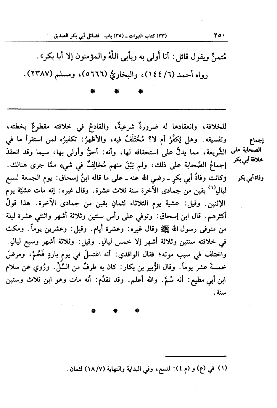 للخلافة، وانعقادها له ضرورة شرعية، والقادح في خلافته مقطوع بخطئه، وتفسيقه. وهل يكفر أم لا؟ مختلف فيه، والأظهر: تكفيره لمن استقرأ ما في الشريعة، مما يدلّ على استحقاقه لها، وأنه: أحق وأولى بها، سيما وقد انعقد إجماع الصحابة على ذلك، ولم يبق منهم مخالف في شيء مِمَّا جرى هنالك.