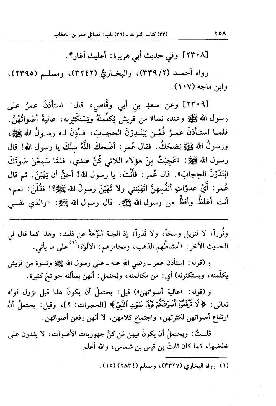 [2309] وعن سَعدِ بنِ أَبِي وَقَّاصٍ قَالَ: استَأذَنَ عُمَرُ عَلَى رَسُولِ اللَّهِ صَلَّى اللَّهُ عَلَيهِ وَسَلَّمَ، وَعِندَهُ نِسَاءٌ مِن قُرَيشٍ يُكَلِّمنَهُ وَيَستَكثِرنَهُ، عَالِيَةً أَصوَاتُهُنَّ، فَلَمَّا استَأذَنَ عُمَرُ قُمنَ يَبتَدِرنَ الحِجَابَ، فَأَذِنَ لَهُ رَسُولُ اللَّهِ صَلَّى اللَّهُ عَلَيهِ وَسَلَّمَ، وَرَسُولُ اللَّهِ صَلَّى اللَّهُ عَلَيهِ وَسَلَّمَ يَضحَكُ. فَقَالَ عُمَرُ: أَضحَكَ اللَّهُ سِنَّكَ يَا رَسُولَ اللَّهِ! قَالَ رَسُولُ اللَّهِ صَلَّى اللَّهُ عَلَيهِ وَسَلَّمَ: عَجِبتُ مِن هَؤُلَاءِ اللَّاتِي كُنَّ عِندِي، فَلَمَّا سَمِعنَ صَوتَكَ ابتَدَرنَ الحِجَابَ. قَالَ عُمَرُ: فَأَنتَ يَا رَسُولَ اللَّهِ أَحَقُّ أَن يَهَبنَ، ثُمَّ قَالَ عُمَرُ: أَي عَدُوَّاتِ أَنفُسِهِنَّ أَتَهَبنَنِي وَلَا تَهَبنَ رَسُولَ اللَّهِ صَلَّى اللَّهُ عَلَيهِ وَسَلَّمَ؟ ! قُلنَ: نَعَم؛ أَنتَ أَغلَظُ وَأَفَظُّ مِن رَسُولِ اللَّهِ صَلَّى اللَّهُ عَلَيهِ وَسَلَّمَ. قَالَ رَسُولُ اللَّهِ صَلَّى اللَّهُ عَلَيهِ وَسَلَّمَ: وَالَّذِي نَفسِي