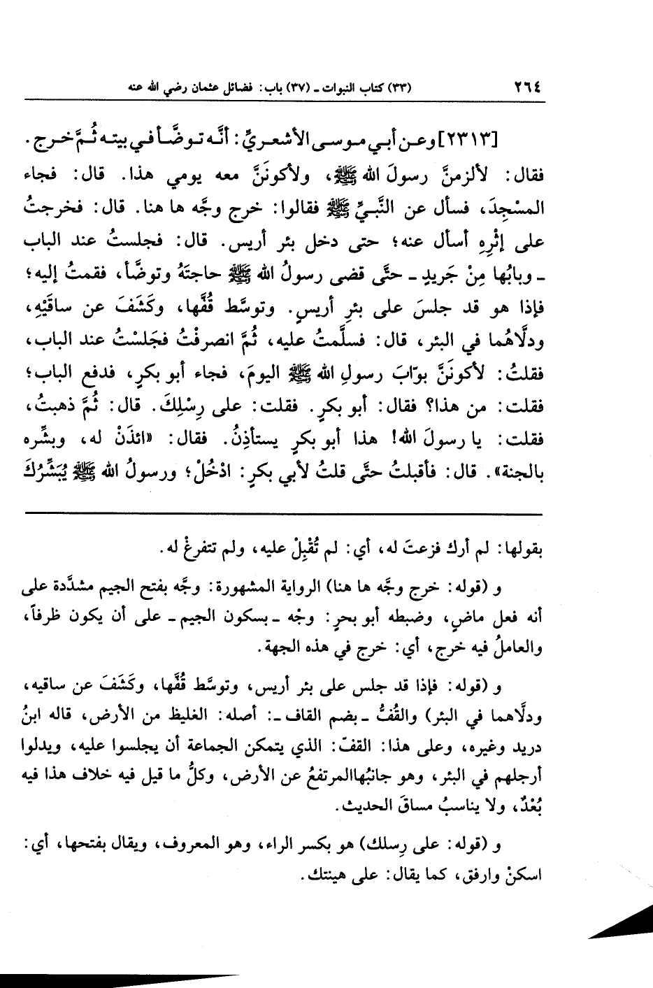 [2313] وعن أبي مُوسَى الأَشعَرِيُّ أَنَّهُ تَوَضَّأَ فِي بَيتِهِ، ثُمَّ خَرَجَ فَقَالَ: لَأَلزَمَنَّ رَسُولَ اللَّهِ صَلَّى اللَّهُ عَلَيهِ وَسَلَّمَ، وَلَأَكُونَنَّ مَعَهُ يَومِي هَذَا، قَالَ: فَجَاءَ المَسجِدَ فَسَأَلَ عَن النَّبِيِّ صَلَّى اللَّهُ عَلَيهِ وَسَلَّمَ فَقَالُوا: خَرَجَ وَجَّهَ هَاهُنَا، قَالَ: فَخَرَجتُ عَلَى إثَرِهِ أَسأَلُ عَنهُ، حَتَّى دَخَلَ بِئرَ أَرِيسٍ، قَالَ: فَجَلَست عِندَ البَابِ - وَبَابُهَا مِن جَرِيدٍ - حَتَّى قَضَى رَسُولُ اللَّهِ صَلَّى اللَّهُ عَلَيهِ وَسَلَّمَ حَاجَتَهُ وَتَوَضَّأَ، فَقُمتُ إِلَيهِ فَإِذَا هُوَ قَد جَلَسَ عَلَى بِئرِ أَرِيسٍ، وَتَوَسَّطَ قُفَّهَا، وَكَشَفَ عَن سَاقَيهِ وَدَلَّاهُمَا فِي البِئرِ. قَالَ: فَسَلَّمتُ عَلَيهِ ثُمَّ انصَرَفتُ، فَجَلَستُ عِندَ البَابِ فَقُلتُ: لَأَكُونَنَّ بَوَّابَ رَسُولِ اللَّهِ صَلَّى اللَّهُ عَلَيهِ وَسَلَّمَ اليَومَ، فَجَاءَ أَبُو بَكرٍ فَدَفَعَ البَابَ، فَقُلتُ مَن هَذَا؟ فَقَالَ أَبُو بَكرٍ، فَقُلتُ: عَلَى رِسلِكَ، قَالَ: ثُمَّ ذَهَبتُ فَقُلتُ: يَا رَسُولَ اللَّهِ هَذَا أَبُو بَكرٍ يَستَأذِنُ، فَقَالَ: ائذَن لَهُ وَبَشِّرهُ بِالجَنَّةِ، قَالَ: فَأَقبَلتُ حَتَّى قُلتُ لِأَبِي بَكرٍ: ادخُل وَرَسُولُ اللَّهِ صَلَّى اللَّهُ عَلَيهِ وَسَلَّمَ يُبَشِّرُكَ