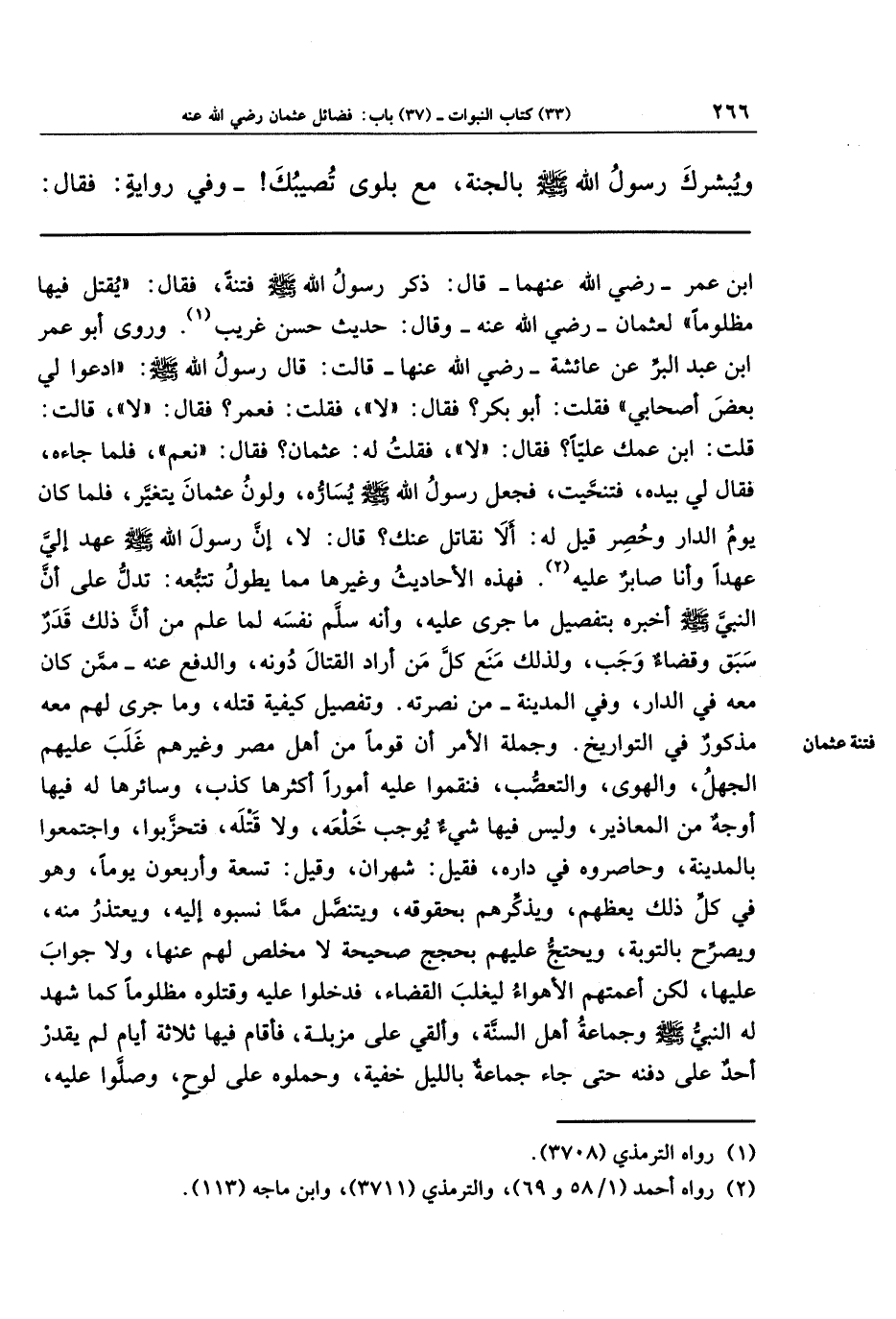 ابن عمر - رضي الله عنهما - قال: ذكر رسول الله ـ صلى الله عليه وسلم ـ فتنةً، فقال: يقتل فيها مظلومًا لعثمان ـ رضي الله عنه ـ، وقال: حديث حسن غريب (¬1).