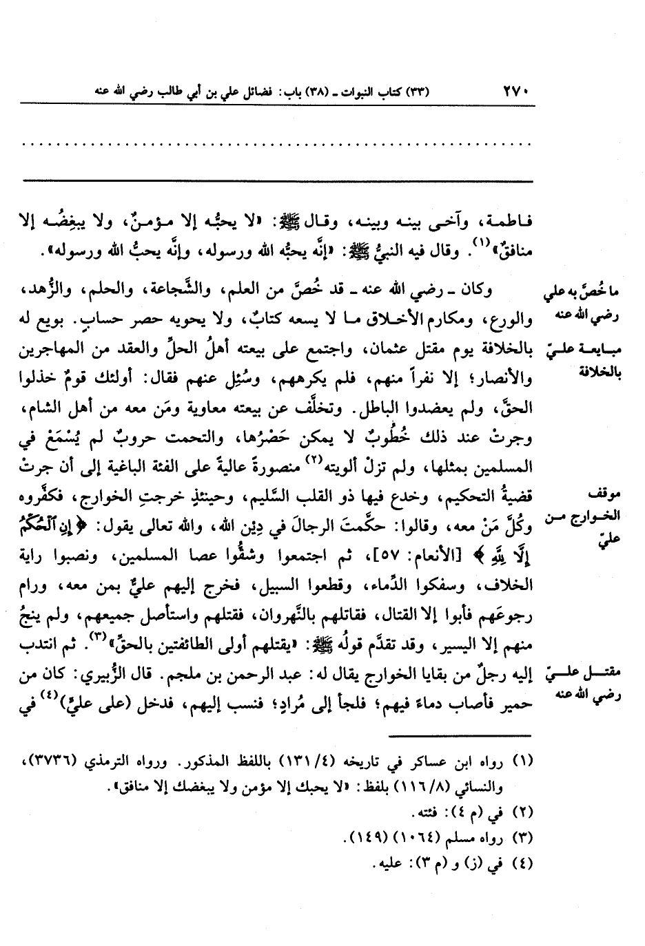 (¬1) رواه ابن عساكر في تاريخه (4/ 131) باللفظ المذكور. ورواه الترمذي (3736)، والنسائي (8/ 116) بلفظ: "لا يحبك إلا مؤمن ولا يبغضك إلا منافق".