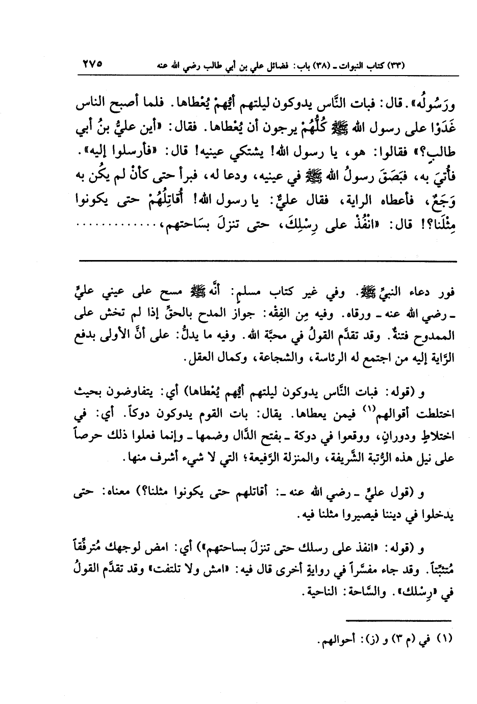 وَرَسُولُهُ قَالَ: فَبَاتَ النَّاسُ يَدُوكُونَ لَيلَتَهُم أَيُّهُم يُعطَاهَا، فَلَمَّا أَصبَحَ النَّاسُ غَدَوا عَلَى رَسُولِ اللَّهِ صَلَّى اللَّهُ عَلَيهِ وَسَلَّمَ كُلُّهُم يَرجُونَ أَن يُعطَاهَا، فَقَالَ: أَينَ عَلِيُّ بنُ أَبِي طَالِبٍ؟ فَقَالُوا: هُوَ يَا رَسُولَ اللَّهِ يَشتَكِي عَينَيهِ، قَالَ: فَأَرسِلُوا إِلَيهِ فَأُتِيَ بِهِ، فَبَصَقَ رَسُولُ اللَّهِ صَلَّى اللَّهُ عَلَيهِ وَسَلَّمَ فِي عَينَيهِ، وَدَعَا لَهُ، فَبَرَأَ حَتَّى كَأَن لَم يَكُن بِهِ وَجَعٌ، فَأَعطَاهُ الرَّايَةَ، فَقَالَ عَلِيٌّ: يَا رَسُولَ اللَّهِ أُقَاتِلُهُم حَتَّى يَكُونُوا مِثلَنَا؟ ! قَالَ: انفُذ عَلَى رِسلِكَ حَتَّى تَنزِلَ بِسَاحَتِهِم،