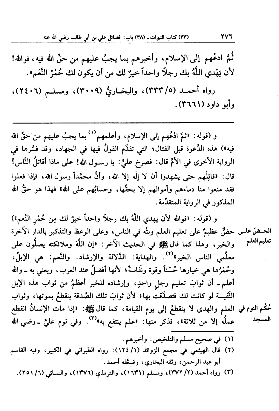 والهداية: الدَّلالة والإرشاد. والنَّعم: هي الإبل، وحمرها هي خيارها حسنًا وقوة ونفاسة، لأنَّها أفضل عند العرب، ويعني به - والله أعلم - أن ثواب تعليم رجل واحد، وإرشاده للخير أعظم من ثواب هذه الإبل النفيسة لو كانت لك فتصدقت بها، لأنَّ ثواب تلك الصدقة ينقطع بموتها، وثواب العلم والهدى لا ينقطع إلى يوم القيامة، كما قال ـ صلى الله عليه وسلم ـ: إذا مات الإنسان انقطع عمله إلا من ثلاثة فذكر منها: علم ينتفع به (¬3). وفي نوم علي ـ رضي الله