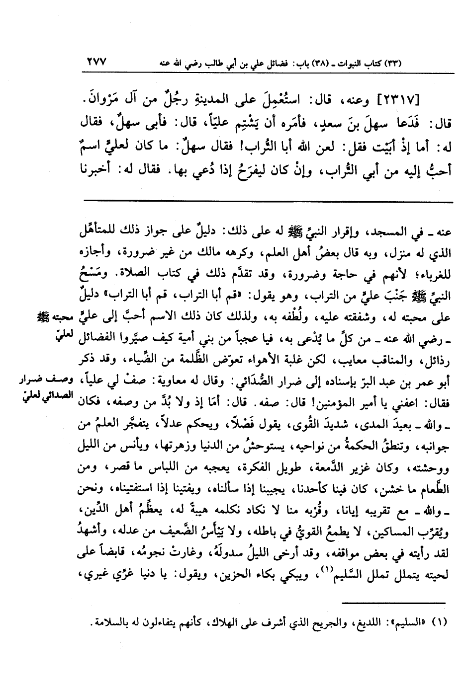 [2317] وعنه قَالَ: استُعمِلَ عَلَى المَدِينَةِ رَجُلٌ مِن آلِ مَروَانَ قَالَ: فَدَعَا سَهلَ بنَ سَعدٍ فَأَمَرَهُ أَن يَشتِمَ عَلِيًّا، قَالَ: فَأَبَى سَهلٌ، فَقَالَ لَهُ: أَمَّا إِذ أَبَيتَ فَقُل: لَعَنَ اللَّهُ أَبَا التُّرَابِ، فَقَالَ سَهلٌ: مَا كَانَ لِعَلِيٍّ اسمٌ أَحَبَّ إِلَيهِ مِن أَبِي التُّرَابِ، وَإِن كَانَ لَيَفرَحُ إِذَا دُعِيَ بِهَا، فَقَالَ لَهُ: أَخبِرنَا