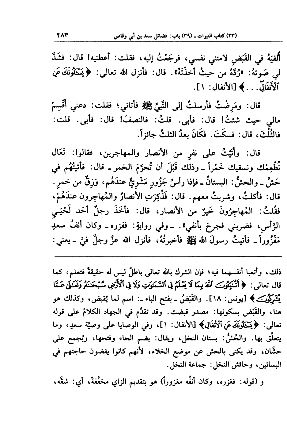 ذلك، وأتعبا أنفسهما فيه، فإن الشرك بالله تعالى باطل ليس له حقيقة فتعلم، كما قال تعالى: {أَتُنَبِّئُونَ اللَّهَ بِمَا لا يَعلَمُ فِي السَّمَاوَاتِ وَلا فِي الأَرضِ سُبحَانَهُ وَتَعَالَى عَمَّا يُشرِكُونَ} والقَبَضُ - بفتح الباء -: اسم لما يُقبض، وكذلك هو هنا، والقَبض بسكونها: مصدر قبضت. وقد تقدم في الجهاد الكلامُ على قوله تعالى: {يَسأَلُونَكَ عَنِ الأَنفَالِ} وفي الوصايا على وصية سعدِ، وما يتعلق بها. والحُشُ: بستان النخل، ويقال: بضم الحاء وفتحها، ويُجمع على حشَّان، وقد يُكنى بالحش عن موضع الخلاء، لأنهم كانوا يقضون حاجتهم في البساتين. وحائش النخل: جماعة النخل.