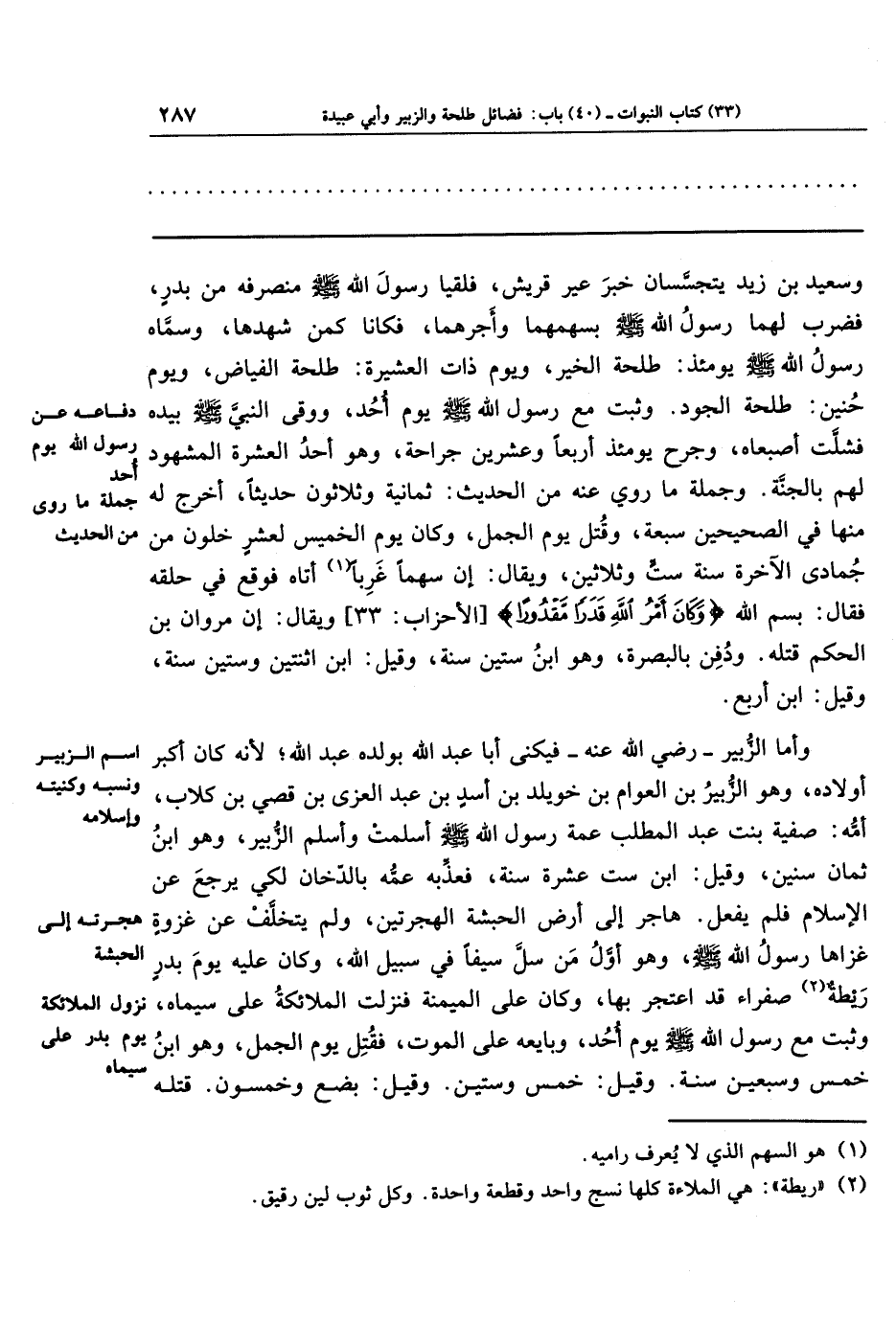 وسعيد بن زيد يتجسَّسان خبر عير قريش، فلقيا رسول الله ـ صلى الله عليه وسلم ـ منصرفه من بدر، فضرب لهما رسول الله ـ صلى الله عليه وسلم ـ بسهمهما وأجرهما، فكانا كمن شهدها، وسَمَّاه رسول الله ـ صلى الله عليه وسلم ـ يومئذ: طلحة الخير، ويوم ذات العشيرة: طلحة الفياض، ويوم حنين: طلحة الجود. وثبت مع رسول الله ـ صلى الله عليه وسلم ـ يوم أحد، ووقى النبي ـ صلى الله عليه وسلم ـ بيده فشلت أصبعاه، وجرح يومئذ أربعًا وعشرين جراحة، وهو أحد العشرة المشهود لهم بالجنة. وجملة ما روي عنه من الحديث: ثمانية وثلاثون حديثًا، أخرج له منها في الصحيحين سبعة، وقتل يوم الجمل، وكان يوم الخميس لعشر خلون من جمادى الآخرة سنة ست وثلاثين، ويقال: إن سهمًا غَربًا (¬1) أتاه فوقع في حلقه فقال: بسم الله {وَكَانَ أَمرُ اللَّهِ قَدَرًا مَقدُورًا} ويقال: إن مروان بن الحكم قتله. ودفن بالبصرة، وهو ابن ستين سنة، وقيل: ابن اثنتين وستين سنة، وقيل: ابن أربع.