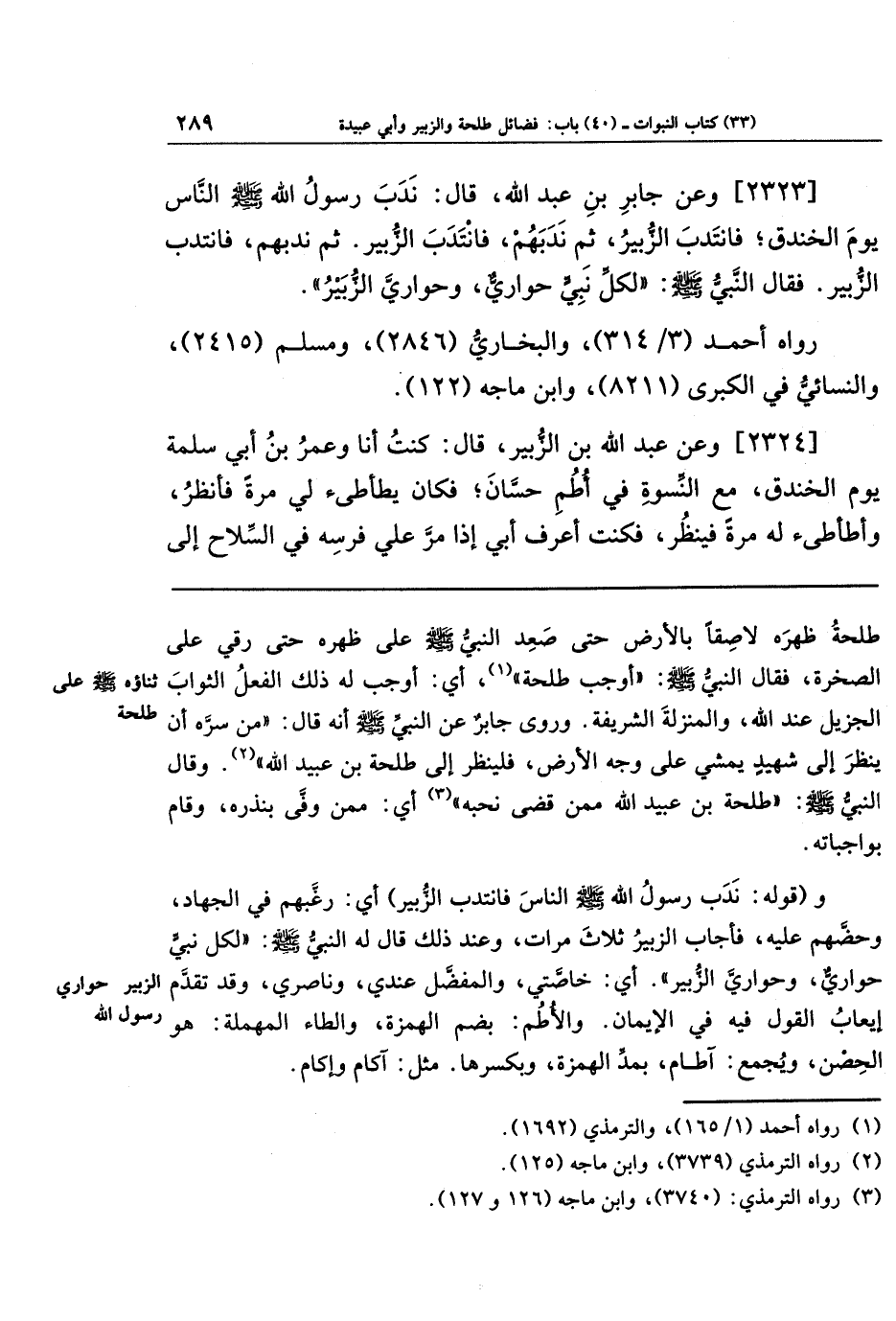 [2323] وعَن جَابِرِ بنِ عَبدِ اللَّهِ قَالَ: نَدَبَ رَسُولُ اللَّهِ صَلَّى اللَّهُ عَلَيهِ وَسَلَّمَ النَّاسَ يَومَ الخَندَقِ فَانتَدَبَ الزُّبَيرُ، ثُمَّ نَدَبَهُم فَانتَدَبَ الزُّبَيرُ، ثُمَّ نَدَبَهُم فَانتَدَبَ الزُّبَيرُ فَقَالَ النَّبِيُّ صَلَّى اللَّهُ عَلَيهِ وَسَلَّمَ: لِكُلِّ نَبِيٍّ حَوَارِيٌّ وَحَوَارِيَّ الزُّبَيرُ.