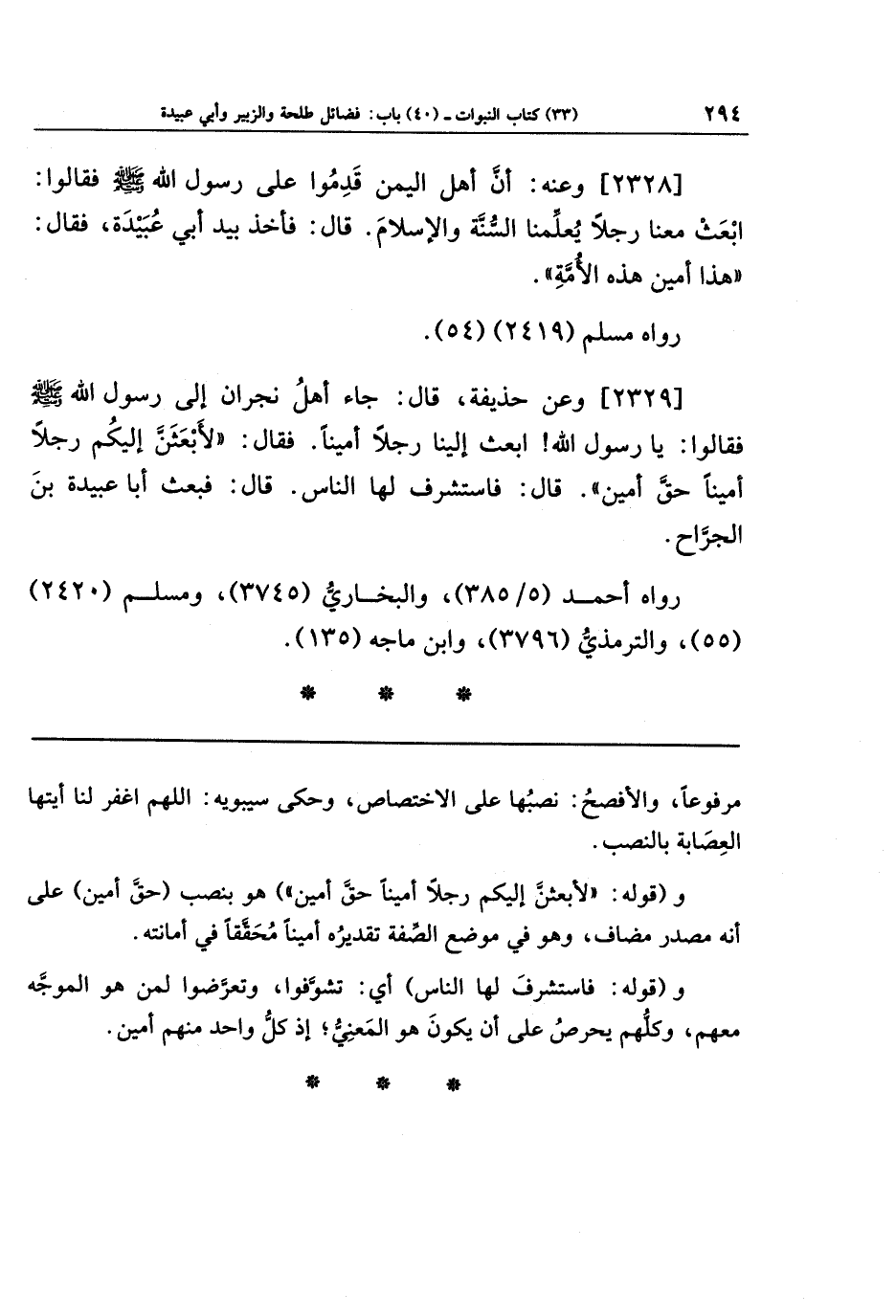 [2329] وعَن حُذَيفَةَ قَالَ: جَاءَ أَهلُ نَجرَانَ إِلَى رَسُولِ اللَّهِ صَلَّى اللَّهُ عَلَيهِ وَسَلَّمَ فَقَالُوا: يَا رَسُولَ اللَّهِ ابعَث إِلَينَا رَجُلًا أَمِينًا، فَقَالَ: لَأَبعَثَنَّ إِلَيكُم رَجُلًا أَمِينًا حَقَّ أَمِينٍ. قَالَ: فَاستَشرَفَ لَهَا النَّاسُ، قَالَ: فَبَعَثَ أَبَا عُبَيدَةَ بنَ الجَرَّاحِ.