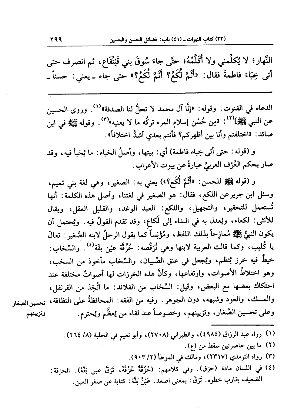النَّهَارِ لَا يُكَلِّمُنِي وَلَا أُكَلِّمُهُ، حَتَّى جَاءَ سُوقَ بَنِي قَينُقَاعَ، ثُمَّ انصَرَفَ حَتَّى أَتَى خِبَاءَ فَاطِمَةَ فَقَالَ: أَثَمَّ لُكَعُ؟ أَثَمَّ لُكَعُ؟ حتى جاء - يَعنِي حَسَنًا -