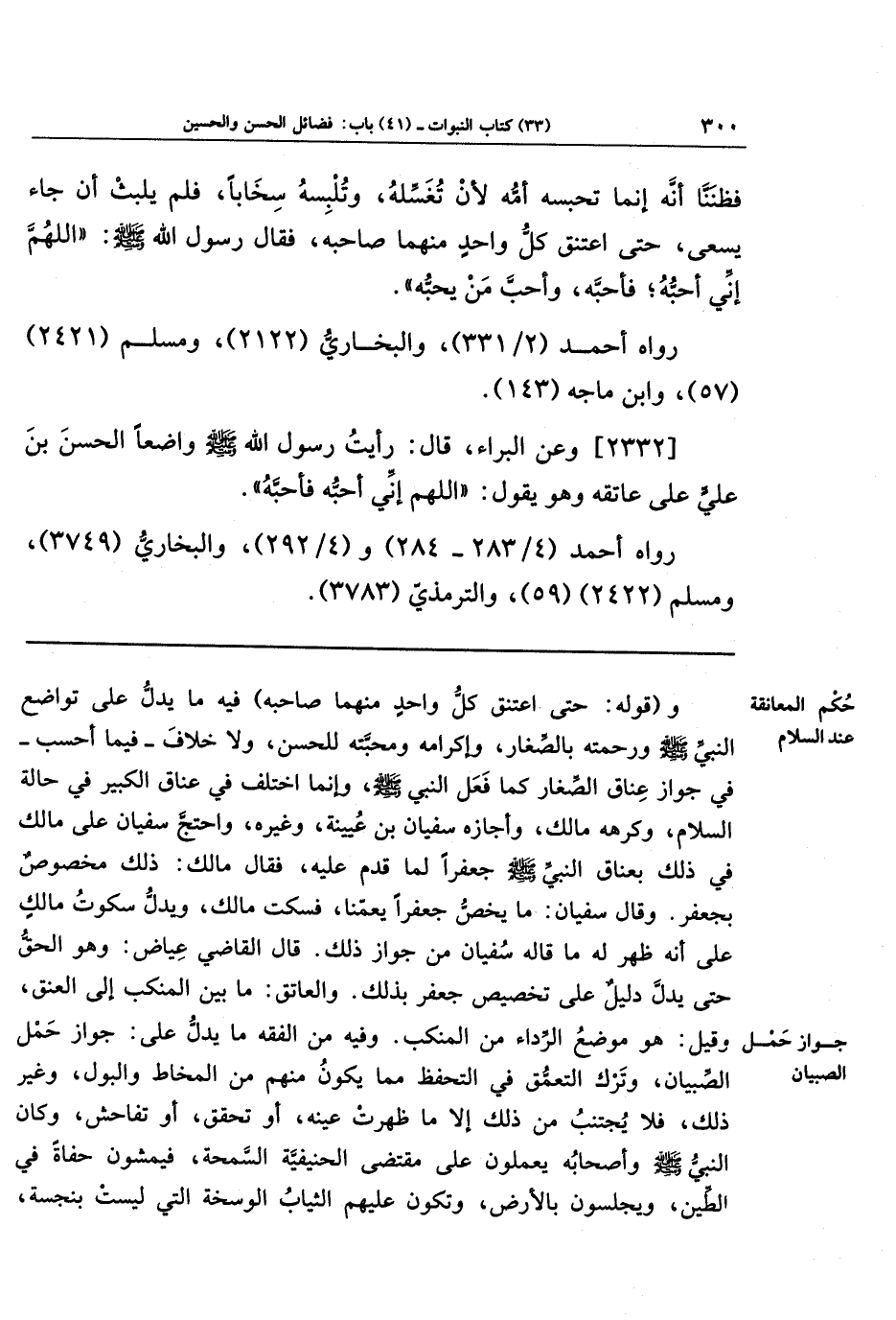 و(قوله: حتى اعتنق كل واحد منهما صاحبه) فيه ما يدل على تواضع النبي ـ صلى الله عليه وسلم ـ ورحمته بالصغار، وإكرامه ومحبَّته للحسن، ولا خلاف - فيما أحسب - في جواز عناق الصِّغار كما فعل النبي ـ صلى الله عليه وسلم ـ، وإنَّما اختلف في عناق الكبير في حالة السلام، وكرهه مالك، وأجازه سفيان بن عيينة، وغيره، واحتج سفيان على مالك في ذلك بعناق النبي ـ صلى الله عليه وسلم ـ جعفرًا لما قَدِم عليه، فقال مالك: ذلك مخصوصٌ بجعفر. وقال سفيان: ما يخص جعفرًا يعمَّنا، فسكت مالك، ويدل سكوت مالك على أنه ظهر له ما قاله سفيان من جواز ذلك. قال القاضي عياض: وهو الحق حتى يدلّ دليل على تخصيص جعفر بذلك.