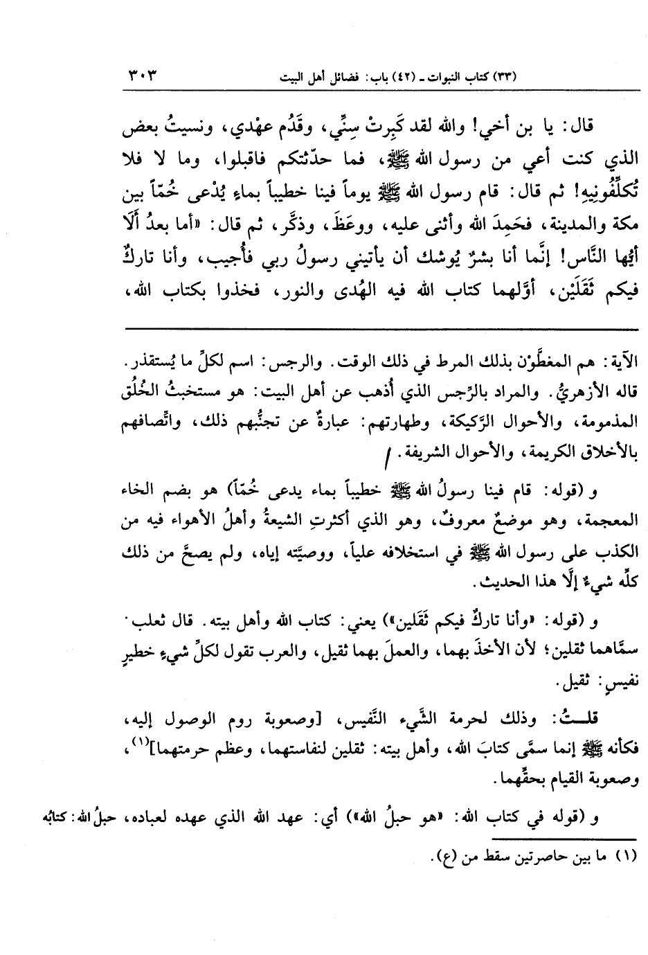 قَالَ: يَا ابنَ أَخِي وَاللَّهِ لَقَد كَبِرَت سِنِّي، وَقَدُمَ عَهدِي، وَنَسِيتُ بَعضَ الَّذِي كُنتُ أَعِي مِن رَسُولِ اللَّهِ صَلَّى اللَّهُ عَلَيهِ وَسَلَّمَ، فَمَا حَدَّثتُكُم فَاقبَلُوا، وَمَا لَا فَلَا تُكَلِّفُونِيهِ، ثُمَّ قَالَ: قَامَ رَسُولُ اللَّهِ صَلَّى اللَّهُ عَلَيهِ وَسَلَّمَ يَومًا فِينَا خَطِيبًا بِمَاءٍ يُدعَى خُمًّا بَينَ مَكَّةَ وَالمَدِينَةِ، فَحَمِدَ اللَّهَ وَأَثنَى عَلَيهِ، وَوَعَظَ وَذَكَّرَ، ثُمَّ قَالَ: أَمَّا بَعدُ أَلَا أَيُّهَا النَّاسُ! فِإِنَّمَا أَنَا بَشَرٌ يُوشِكُ أَن يَأتِيَ رَسُولُ رَبِّي فَأُجِيبَ، وَأَنَا تَارِكٌ فِيكُم ثَقَلَينِ أَوَّلُهُمَا كِتَابُ اللَّهِ فِيهِ الهُدَى وَالنُّورُ، فَخُذُوا بِكِتَابِ اللَّهِ،