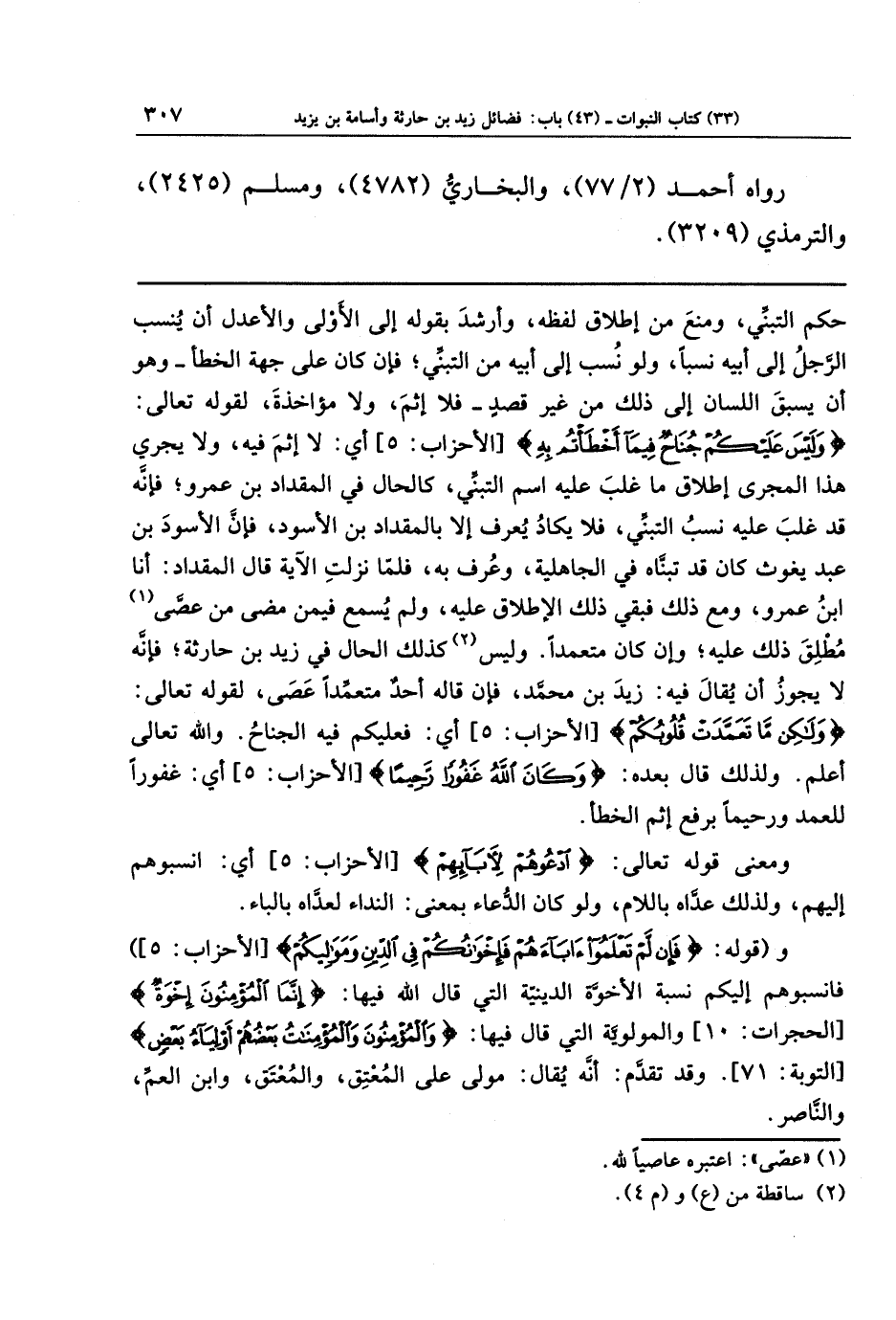 حكم التبني، ومنع من إطلاق لفظه، وأرشد بقوله إلى الأولى والأعدل أن يُنسب الرَّجل إلى أبيه نسبًا، ولو نسب إلى أبيه من التبني، فإنَّ كان على جهة الخطأ - وهو أن يسبق اللسان إلى ذلك من غير قصد - فلا إثم، ولا مؤاخذة، لقوله تعالى: {وَلَيسَ عَلَيكُم جُنَاحٌ فِيمَا أَخطَأتُم بِهِ}، أي: لا إثم فيه، ولا يجري هذا المجرى إطلاق ما غلب عليه اسم التبني، كالحال في المقداد بن عمرو، فإنَّه قد غلب عليه نسب التبني، فلا يكاد يعرف إلا بالمقداد بن الأسود، فإنَّ الأسود بن عبد يغوث كان قد تبناه في الجاهلية، وعرف به، فلما نزلت الآية قال المقداد: أنا ابن عمرو، ومع ذلك فبقي ذلك الإطلاق عليه، ولم يسمع فيمن مضى من عصَّى (¬1) مُطلِق ذلك عليه، وإن كان متعمدًا. وليس (¬2) كذلك الحال في زيد بن حارثة، فإنَّه لا يجوز أن يقال فيه: زيد بن محمَّد، فإن قاله أحدٌ متعمِّدًا عَصَى، لقوله تعالى: {وَلَكِن مَا تَعَمَّدَت قُلُوبُكُم} أي: فعليكم فيه الجناح. والله تعالى أعلم. ولذلك قال بعده: {وَكَانَ اللَّهُ غَفُورًا رَحِيمًا} أي: غفورًا للعمد ورحيمًا برفع إثم الخطأ.