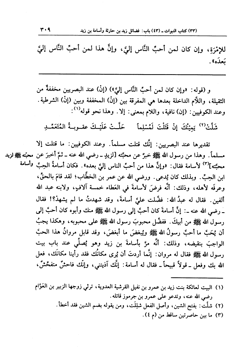 وهذا من رسول الله ـ صلى الله عليه وسلم ـ خبر عن محبته [لزيد ـ رضي الله عنه ـ، ثمَّ أخبر عن محبته] (¬3) لأسامة فقال: وإن هذا لمن أحب الناس إلي بعده. فكان أسامة الحبُّ ابن الحبِّ. وبذلك كان يُدعى. ورضي الله عن عمر بن الخطاب، لقد قام بالحق، وعرفَه لأهله، وذلك: أنَّه فرض لأسامةَ في العطاء خمسة آلاف، ولابنه عبد الله ألفين. فقال له عبد الله: فضلت عليَّ أسامة، وقد شهدت ما لم يشهد؟ ! فقال ـ رضي الله عنه ـ: إن أسامة كان أحب إلى رسول الله ـ صلى الله عليه وسلم ـ منك، وأبوه كان أحب إلى رسول الله ـ صلى الله عليه وسلم ـ من أبيك. ففضل محبوب رسول الله ـ صلى الله عليه وسلم ـ على محبوبه، وهكذا يجب أن يحب ما أحب رسول الله ـ صلى الله عليه وسلم ـ ويبغض ما أبغض، وقد قابل مروان هذا الحب الواجب بنقيضه، وذلك: أنَّه مرَّ بأسامة بن زيد وهو يصلي عند باب بيت رسول الله ـ صلى الله عليه وسلم ـ، فقال له مروان: إنَّما أردت أن يُرى مكانك فقد رأينا مكانك، فعل الله بك وفعل - قولًا قبيحًا - فقال له أسامة: إنَّك آذيتني، وإنَّك فاحش متفحش،