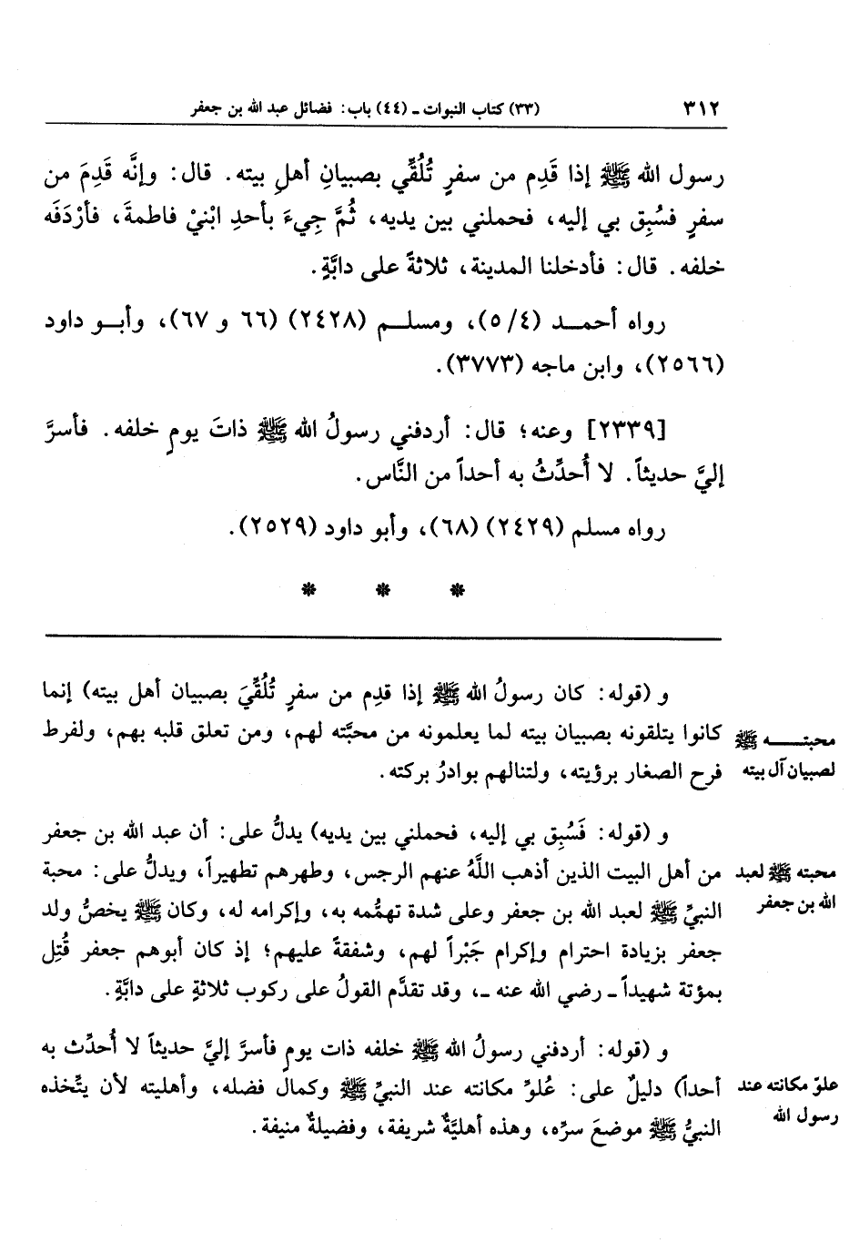 رَسُولُ اللَّهِ صَلَّى اللَّهُ عَلَيهِ وَسَلَّمَ إِذَا قَدِمَ مِن سَفَرٍ تُلُقِّيَ بِصِبيَانِ أَهلِ بَيتِهِ قَالَ: وَإِنَّهُ قَدِمَ مِن سَفَرٍ فَسُبِقَ بِي إِلَيهِ، فَحَمَلَنِي بَينَ يَدَيهِ، ثُمَّ جِيءَ بِأَحَدِ ابنَي فَاطِمَةَ، فَأَردَفَهُ خَلفَهُ، قَالَ: فَأُدخِلنَا المَدِينَةَ ثَلَاثَةً عَلَى دَابَّةٍ.