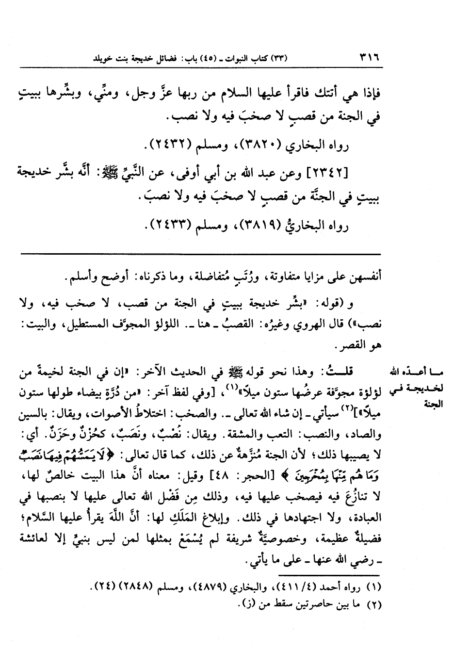[2342] وعن عَبدِ اللَّهِ بنِ أَبِي أَوفَى، عن النبي صَلَّى اللَّهُ عَلَيهِ وَسَلَّمَ: أنه بَشَّرَ خَدِيجَةَ بِبَيتٍ فِي الجَنَّةِ مِن قَصَبٍ لَا صَخَبَ فِيهِ وَلَا نَصَبَ.