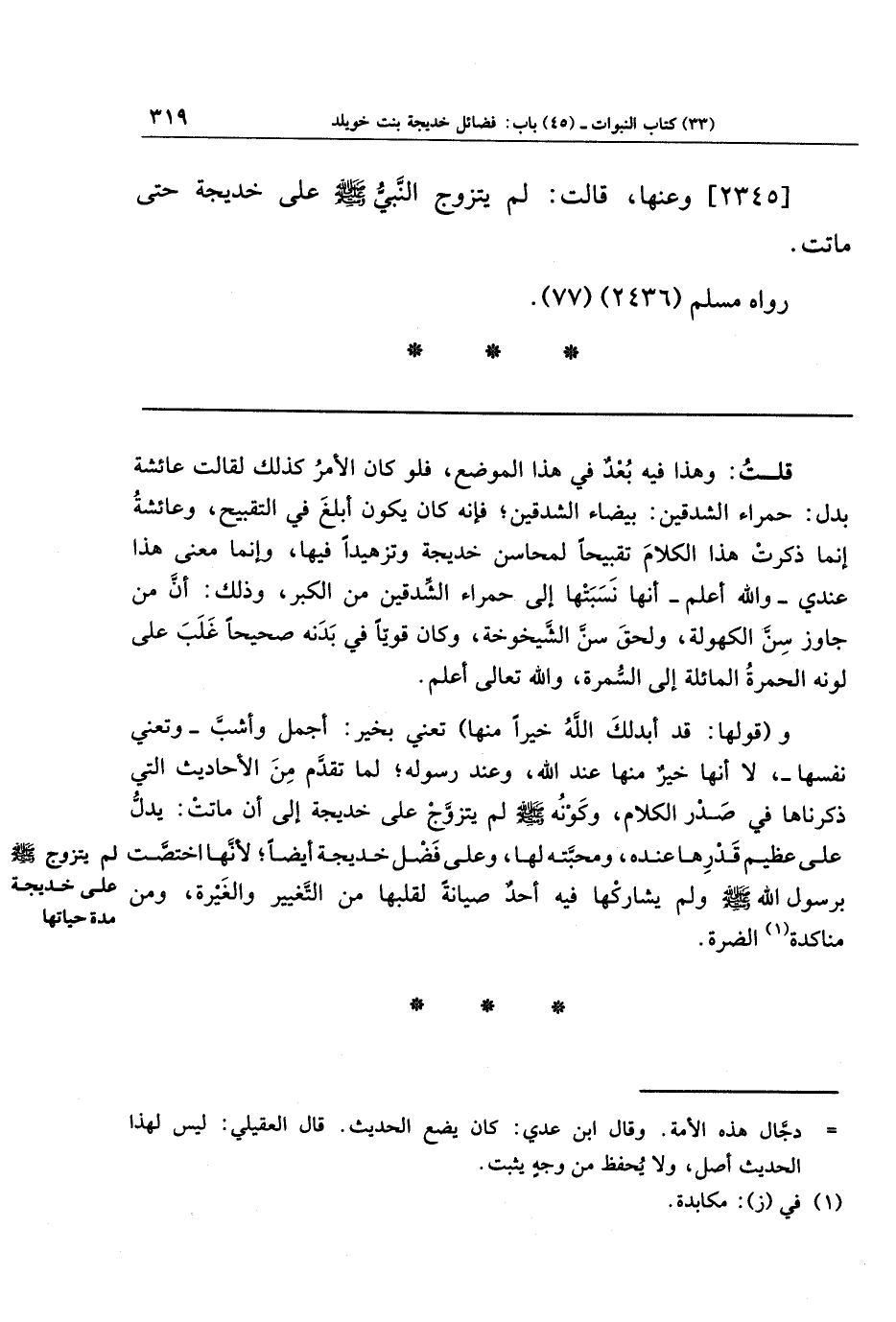 [2345] وعنها قالت: لَم يَتَزَوَّج النَّبِيُّ صَلَّى اللَّهُ عَلَيهِ وَسَلَّمَ عَلَى خَدِيجَةَ حَتَّى مَاتَت.