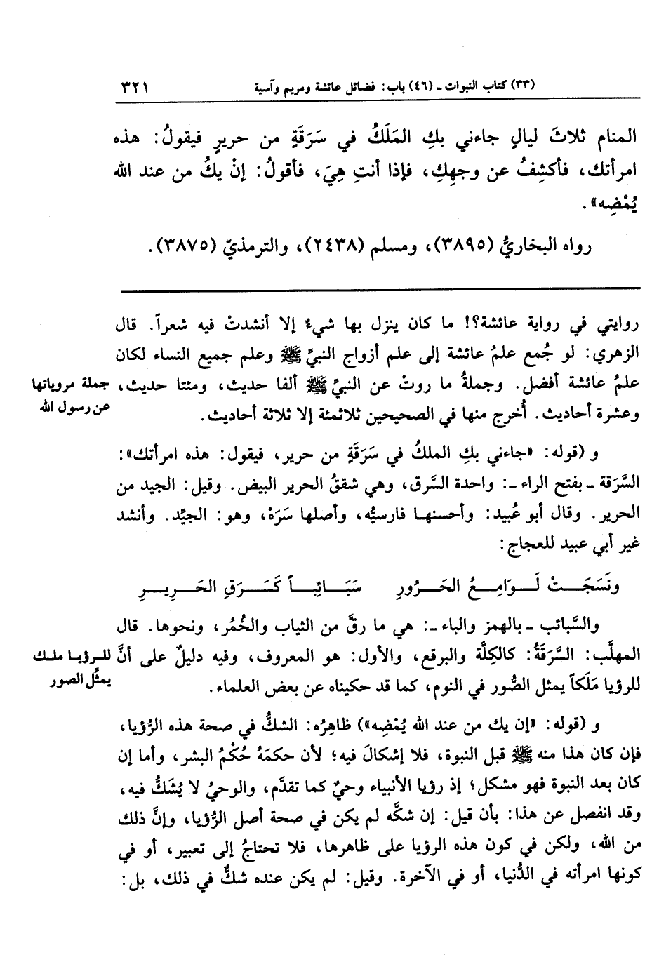 المَنَامِ ثَلَاثَ لَيَالٍ جَاءَنِي بِكِ المَلَكُ فِي سَرَقَةٍ مِن حَرِيرٍ فَيَقُولُ: هَذِهِ امرَأَتُكَ فَأَكشِفُ عَن وَجهِكِ، فَإِذَا أَنتِ هِيَ، فَأَقُولُ: إِن يَكُ مِن عِندِ اللَّهِ يُمضِهِ.