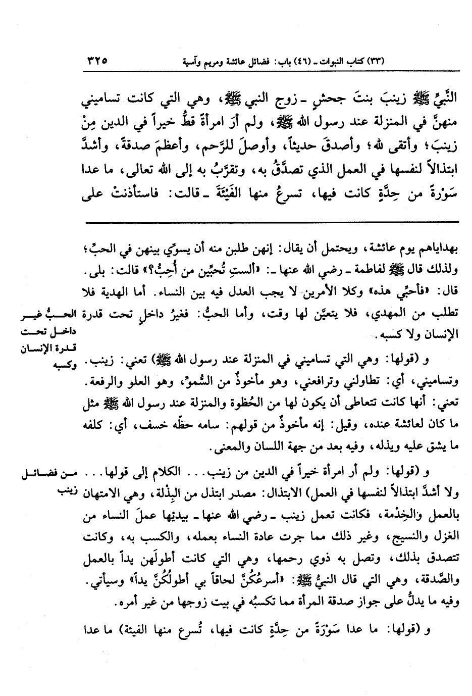 النَّبِيِّ صَلَّى اللَّهُ عَلَيهِ وَسَلَّمَ زَينَبَ بِنتَ جَحشٍ - زَوجَ النَّبِيِّ صَلَّى اللَّهُ عَلَيهِ وَسَلَّمَ، وَهِيَ الَّتِي كَانَت تُسَامِينِي مِنهُنَّ فِي المَنزِلَةِ عِندَ رَسُولِ اللَّهِ صَلَّى اللَّهُ عَلَيهِ وَسَلَّمَ، وَلَم أَرَ امرَأَةً قَطُّ خَيرًا فِي الدِّينِ مِن زَينَبَ، وَأَتقَى لِلَّهِ، وَأَصدَقَ حَدِيثًا، وَأَوصَلَ لِلرَّحِمِ، وَأَعظَمَ صَدَقَةً، وَأَشَدَّ ابتِذَالًا لِنَفسِهَا فِي العَمَلِ الَّذِي تَصَدَّقُ بِهِ، وَتَقَرَّبُ بِهِ إِلَى اللَّهِ تَعَالَى مَا عَدَا سَورَةً مِن حِدَّةٍ كَانَت فِيهَا، تُسرِعُ مِنهَا الفَيئَةَ - قَالَت: فَاستَأذَنَت عَلَى