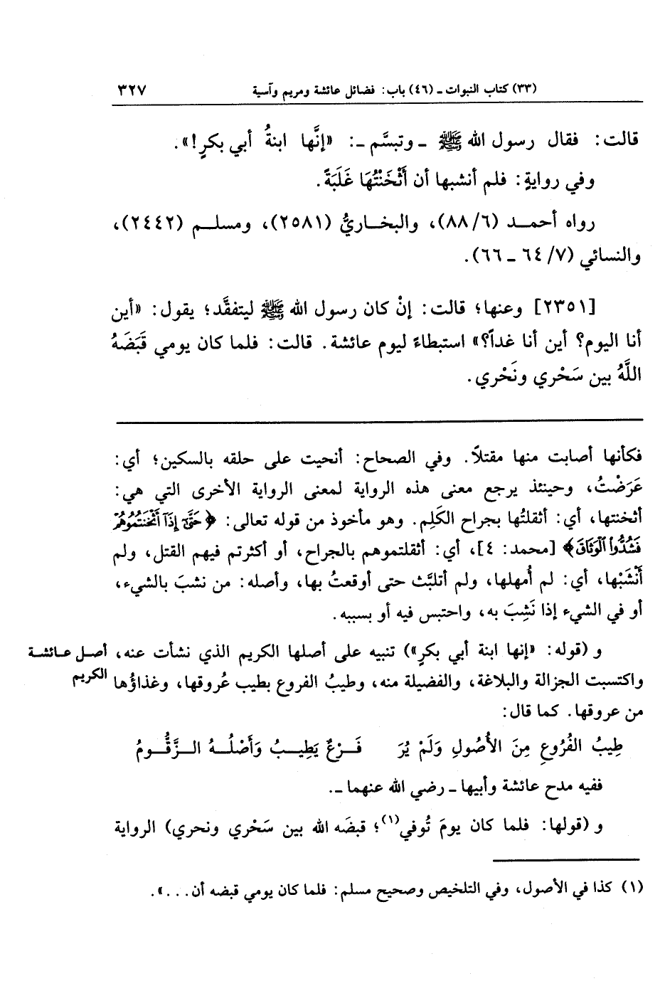[2351] وعنها قالت: إِن كَانَ رَسُولُ اللَّهِ صَلَّى اللَّهُ عَلَيهِ وَسَلَّمَ لَيَتَفَقَّدُ، يَقُولُ: أَينَ أَنَا اليَومَ؟ أَينَ أَنَا غَدًا؟ استِبطَاءً لِيَومِ عَائِشَةَ، قَالَت: فَلَمَّا كَانَ يَومِي قَبَضَهُ اللَّهُ بَينَ سَحرِي وَنَحرِي.